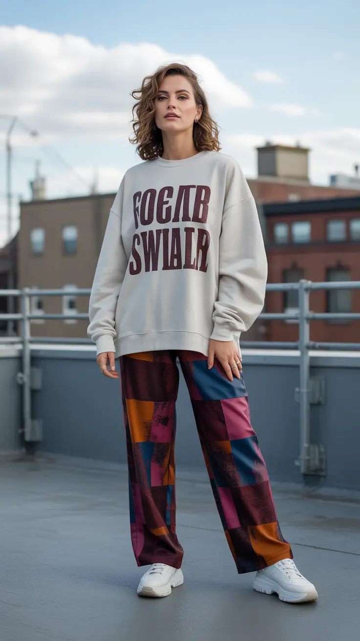 This outfit inspo is all about mixing comfort with flair. The graphic sweatshirt not only keeps you cozy but also serves as a canvas for self-expression. Meanwhile, the statement pants add a playful element, making them perfect for performance outfits or just hanging out with friends.