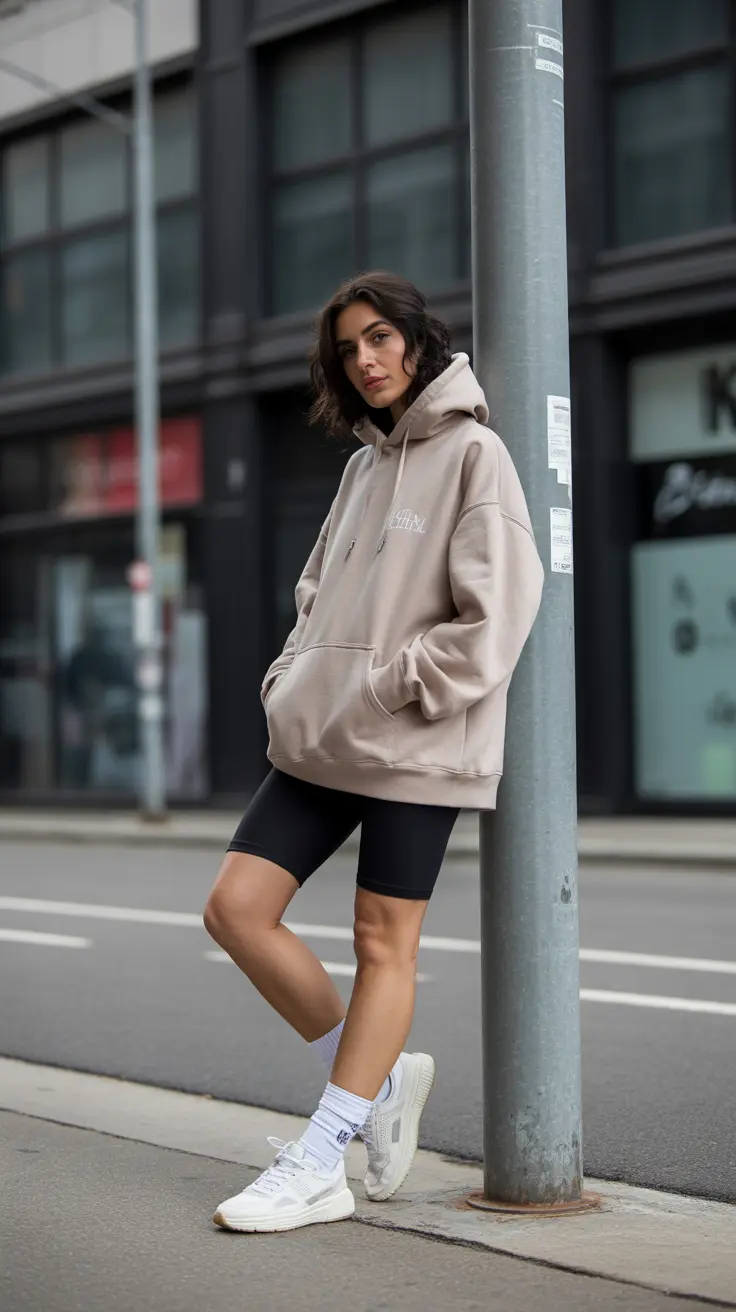 Layered oversized hoodies paired with bike shorts create a perfect blend of comfort and style. This look is not just about staying cozy; it’s a bold fashion statement that resonates with urban style. The oversized hoodie adds a relaxed vibe, while the bike shorts keep things sleek and sporty.