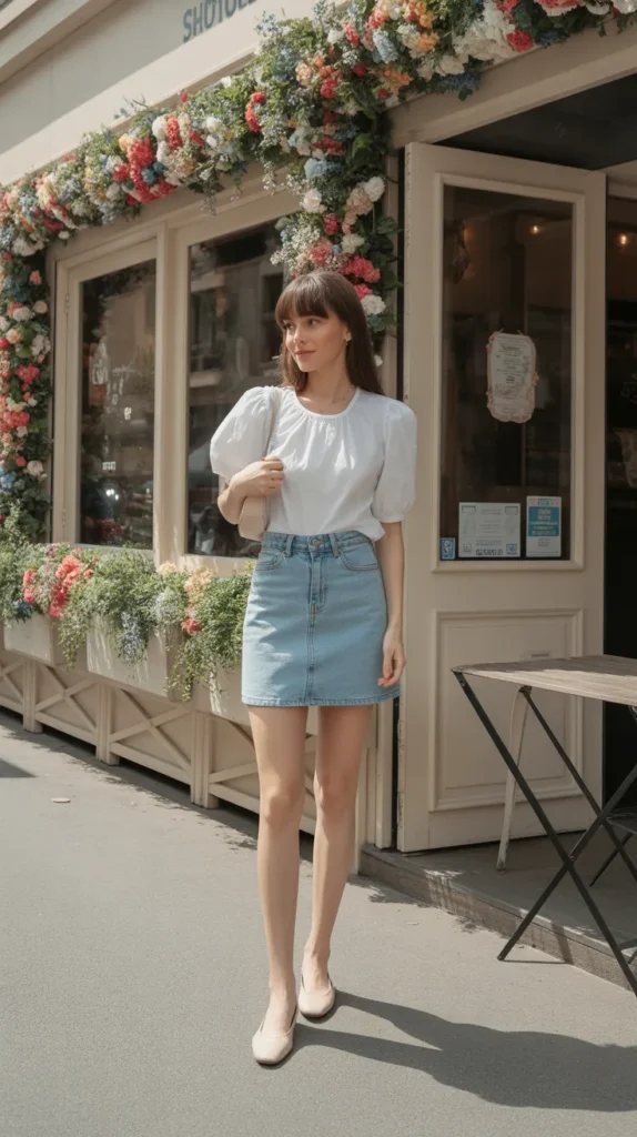 1. Light Blue Mini Denim Skirt With a White Puff-Sleeve Blouse