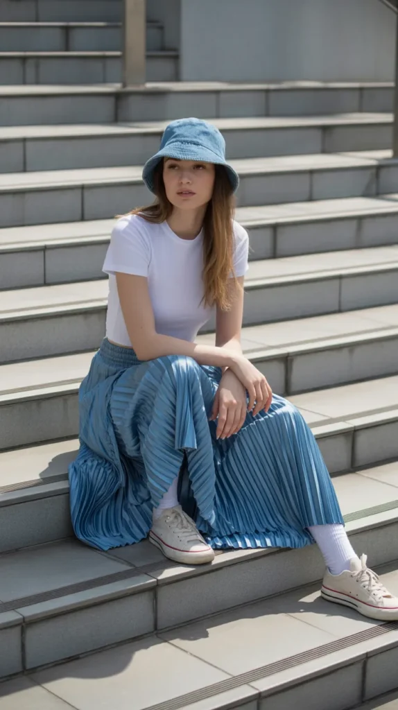 11. Blue Pleated Denim Skirt With a Basic Tee and Bucket Hat