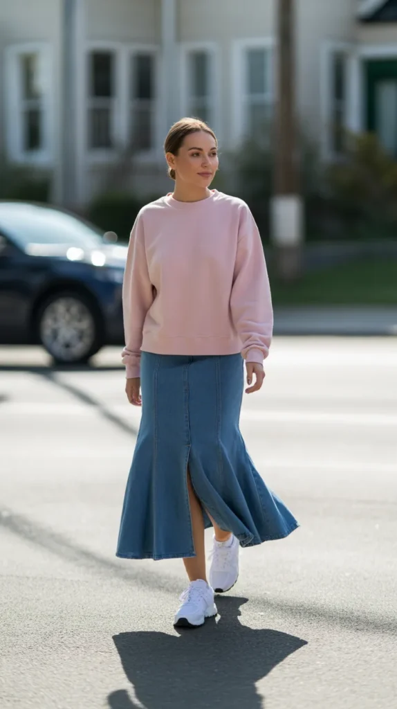 13. Long Blue Jeans Skirt With a Soft Pink Sweatshirt