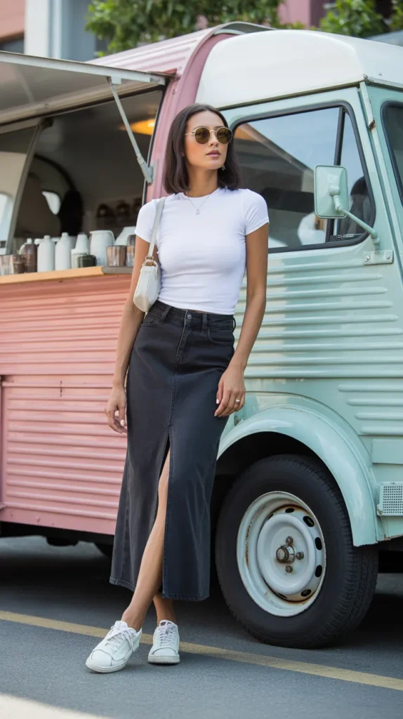 14. Black Denim Maxi Skirt With a White Fitted Tee