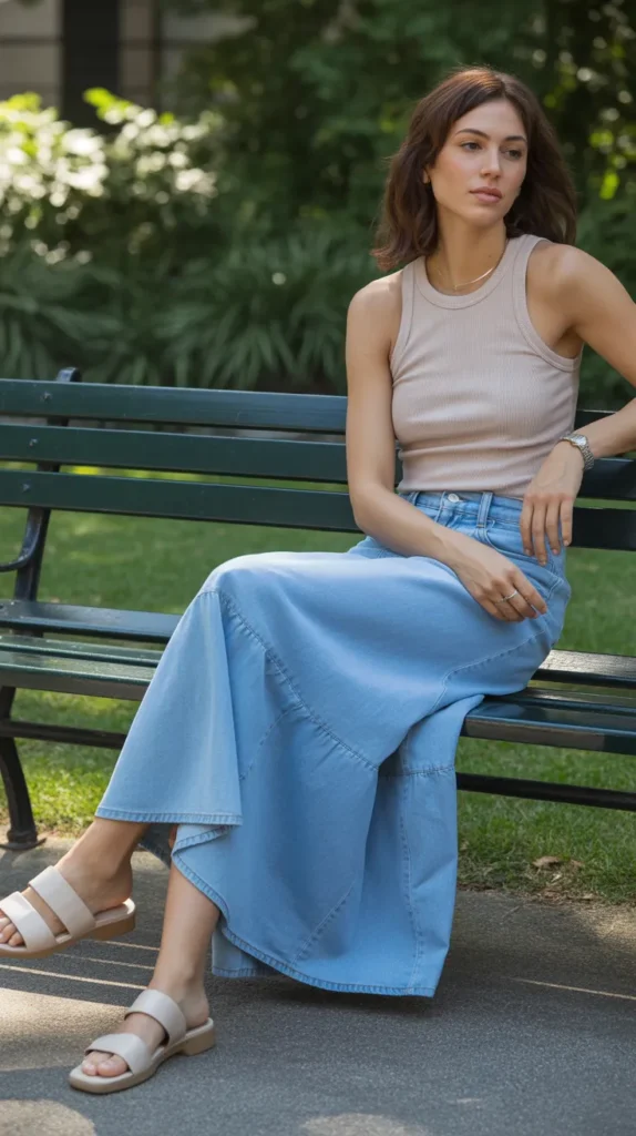 2. Long Blue Denim Maxi Skirt Styled With a Fitted Ribbed Tank