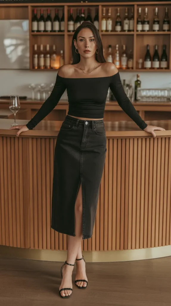8. Black Midi Jeans Skirt With a Fitted Off-Shoulder Top