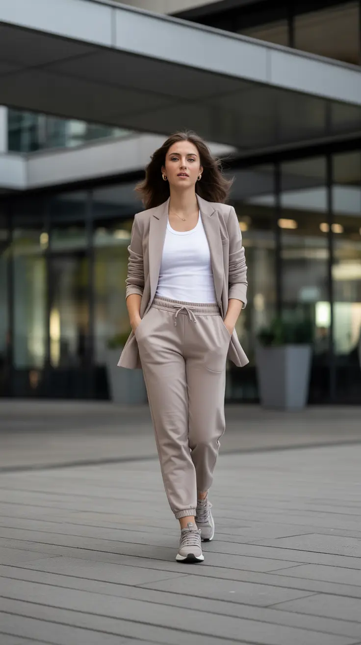 Jogger pants are a fantastic choice for a casual-chic look, especially when paired with a blazer. This outfit combines comfort and style effortlessly. The model showcases a sleek gray blazer over a simple white top, creating a polished yet relaxed vibe.