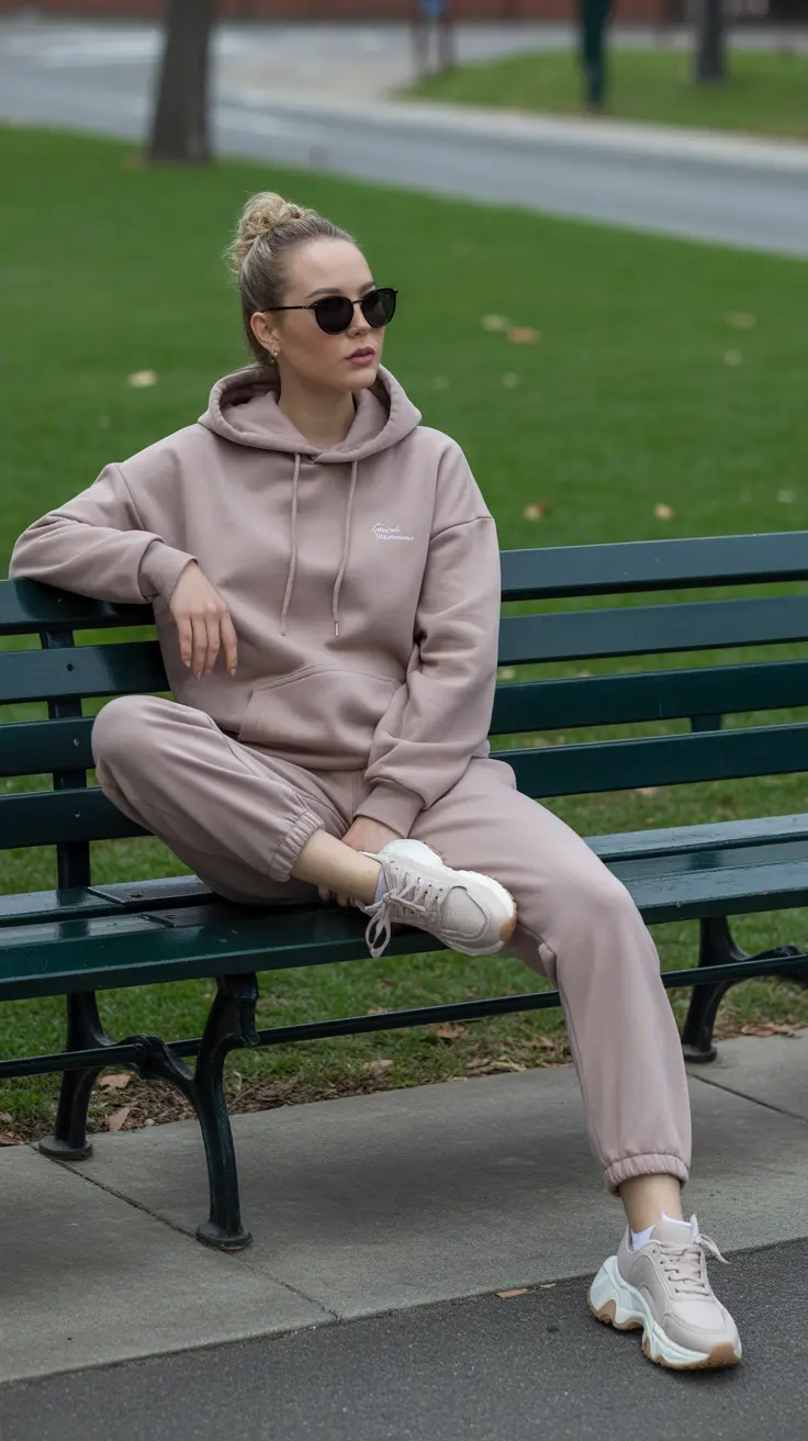 When it comes to a comfy weekend look, jogger pants paired with a cozy hoodie is a winning combo. The image shows a woman in a relaxed outfit that perfectly embodies casual-chic vibes. She’s wearing a soft brown hoodie and dark jogger pants, making it easy to lounge around or step out for errands.