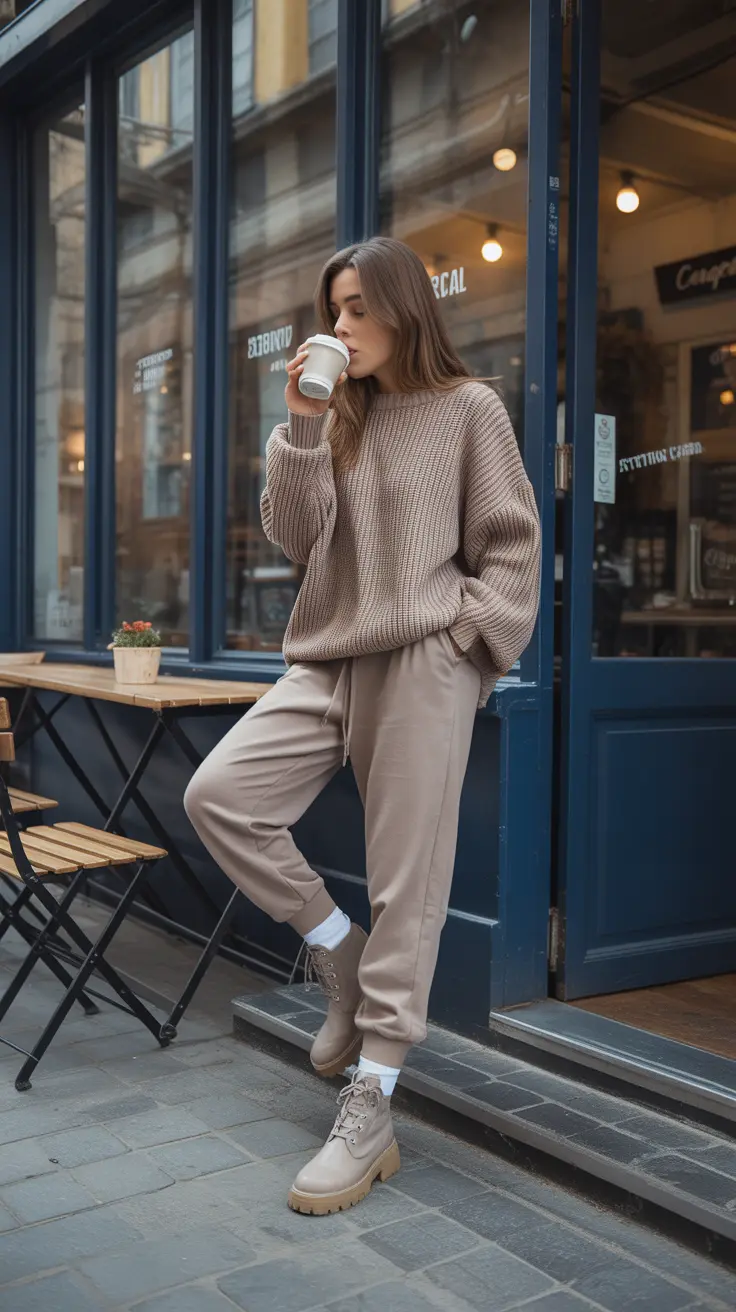 Brown lace-up boots complete the outfit, providing a trendy touch while keeping it casual. This jogger pants outfit for women is ideal for a stroll in the park or a casual meet-up with friends. It’s a great example of outfit inspo for those who love casual-chic looks.