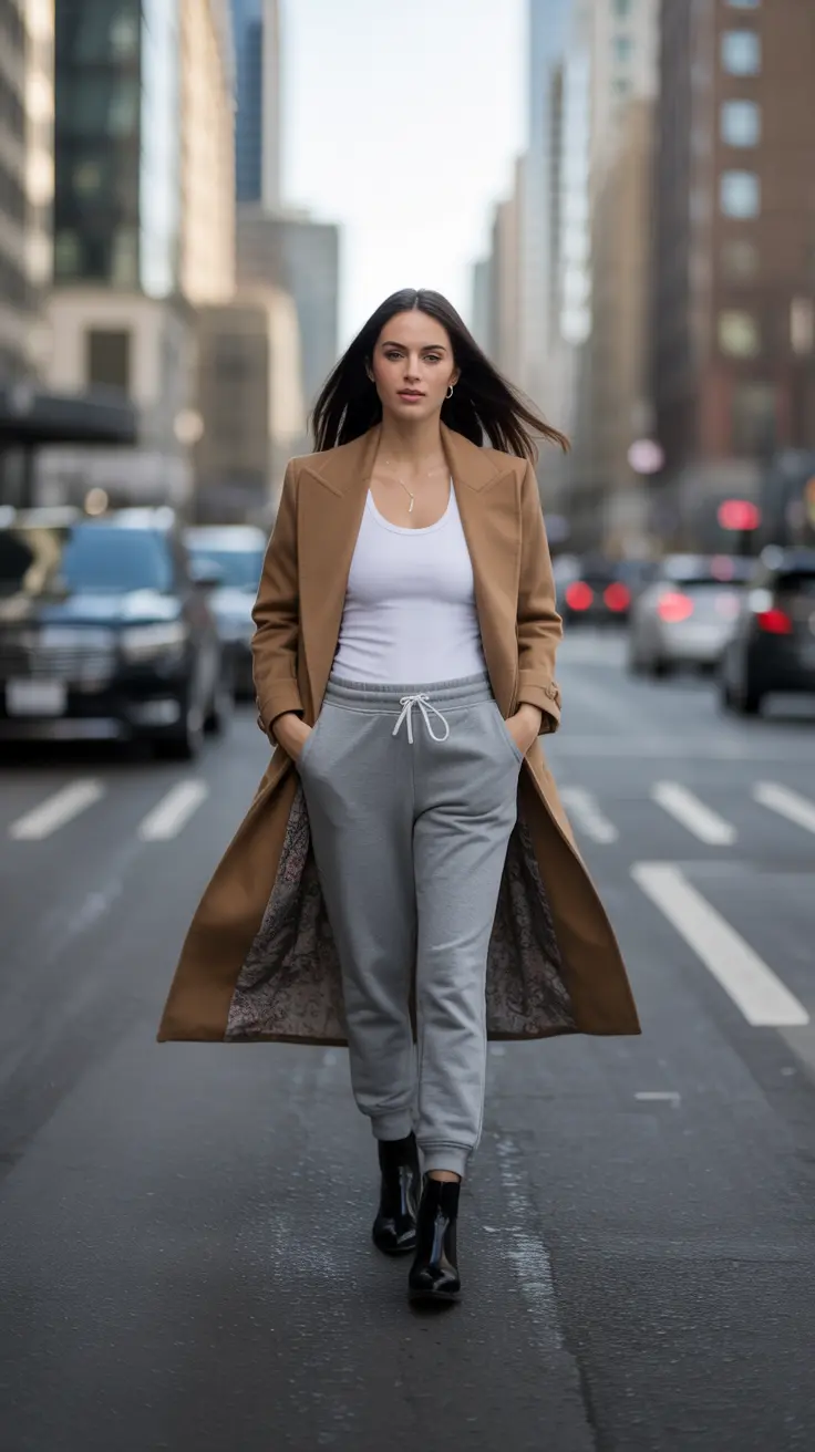 In the image, a woman confidently walks through a city street, showcasing her joggers outfit. The tailored coat adds sophistication, while the joggers keep it relaxed. This outfit inspo is great for anyone looking to elevate their jogger pants outfit.