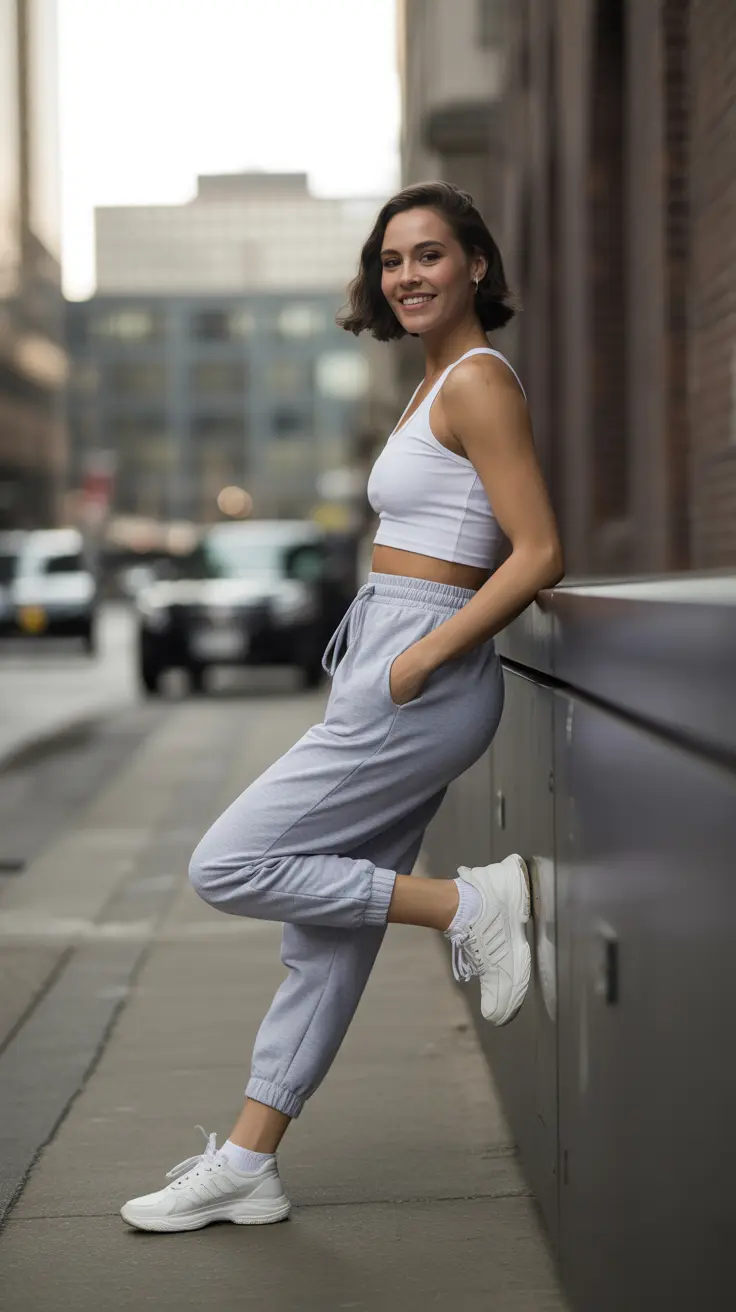 Jogger pants are a fantastic choice for a sporty chic look. Pairing them with a crop top creates a stylish and comfortable outfit that works for various occasions. In the image, a woman confidently struts down the street in a sleek black crop top and gray jogger pants. This combination highlights her figure while keeping the vibe relaxed and trendy.