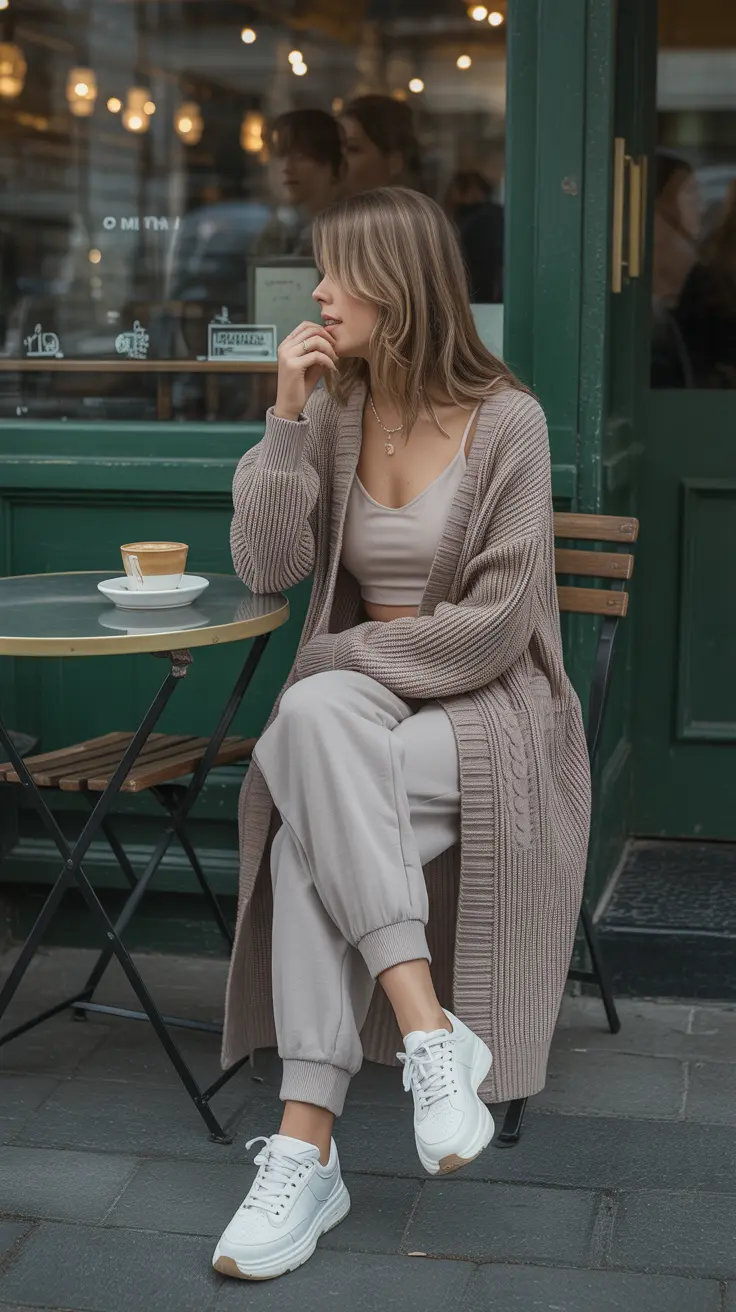 Layering is a fantastic way to elevate your joggers outfit. A long cardigan adds warmth and style, making it perfect for cooler days. In this look, the model pairs a cozy, oversized cardigan with jogger pants, creating a relaxed yet chic vibe.