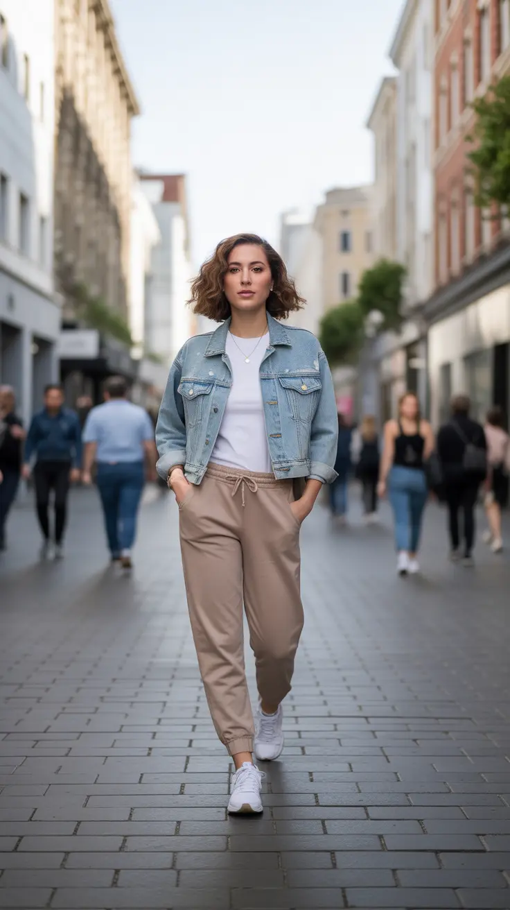 In the image, you can see a stylish outfit featuring jogger pants and a denim jacket. The light-colored joggers are comfortable yet trendy, making them perfect for a day out. The denim jacket complements the outfit, creating a laid-back yet put-together appearance.