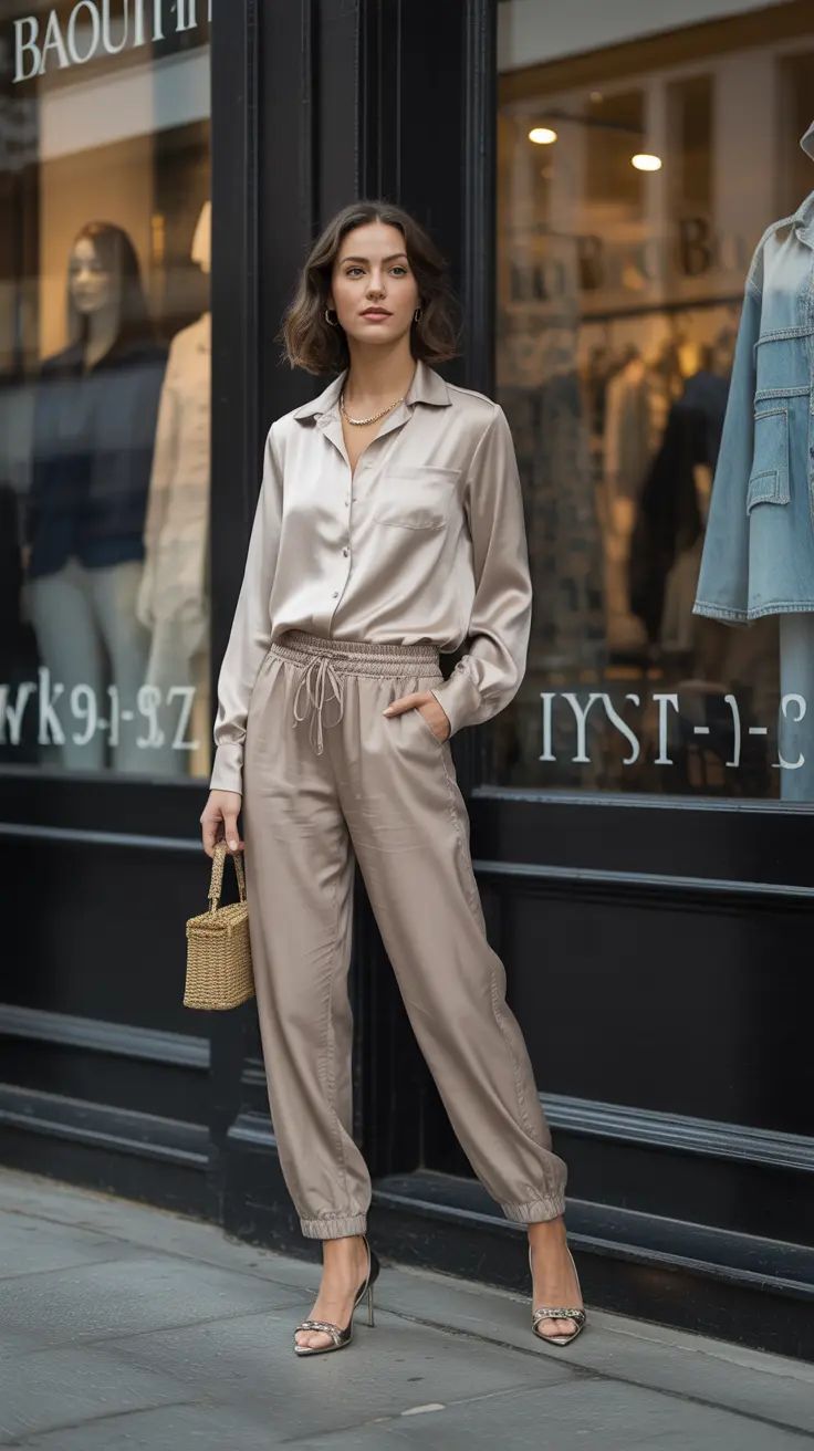 In the image, a woman showcases this stylish combination. She wears a light silk blouse paired with sleek jogger pants, creating a chic look that balances comfort and elegance. The soft color palette enhances the overall aesthetic, making it suitable for both day and evening outings.