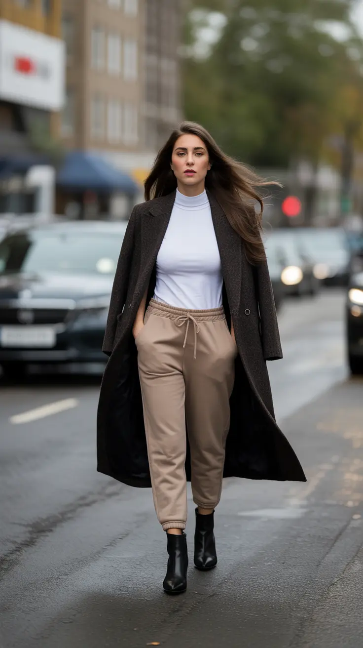 The sleek lines of the coat contrast beautifully with the casual vibe of the joggers. Sneakers complete the look, making it both chic and practical. This is a perfect example of how jogger pants can be styled for various occasions.
