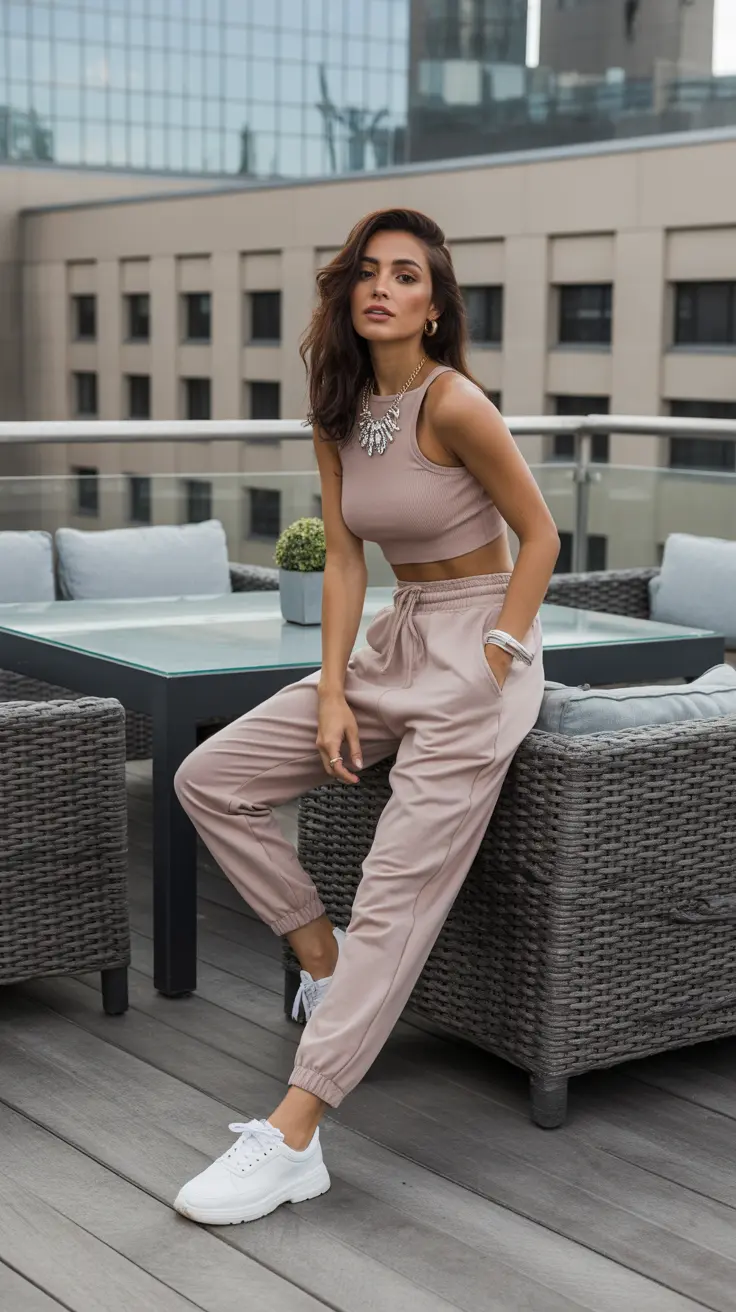 Accessorizing is key to completing the joggers outfit. A pair of trendy sneakers adds a sporty touch, making it easy to transition from day to night. This outfit inspo is perfect for women who love to mix comfort with style.