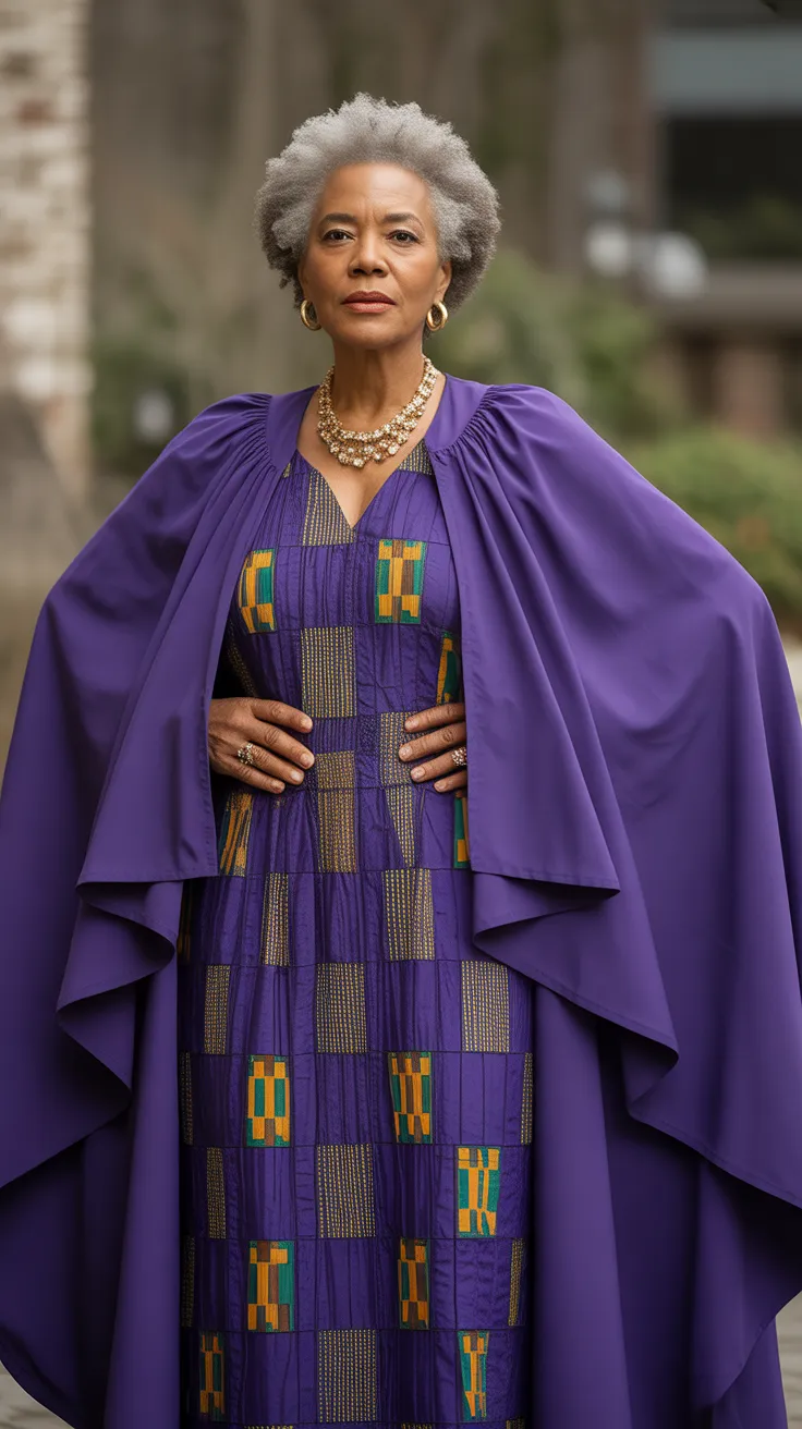 The royal purple Kente dress with cape sleeves is a stunning choice for older women who want to showcase their style and cultural heritage. This dress combines modern design with traditional elements, making it perfect for various occasions.