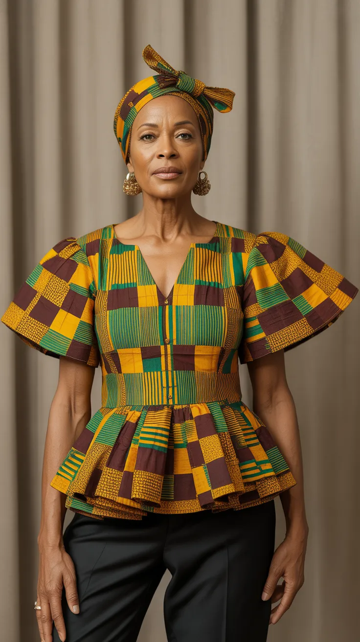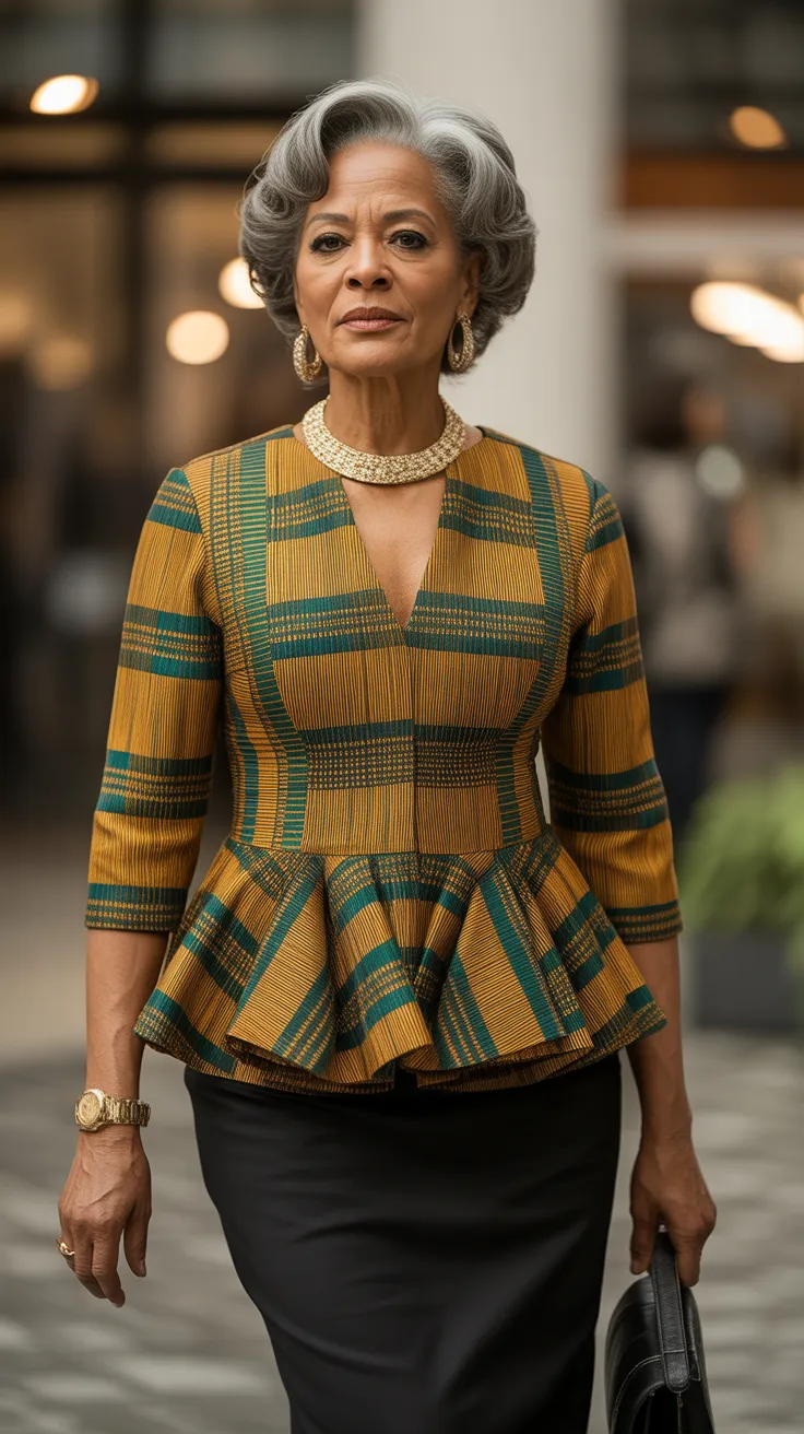 The gold accented Kente peplum blouse paired with a sleek pencil skirt is a stunning choice for older women looking to blend tradition with modern style. The rich colors and intricate patterns of the Kente fabric bring a sense of cultural pride and elegance.