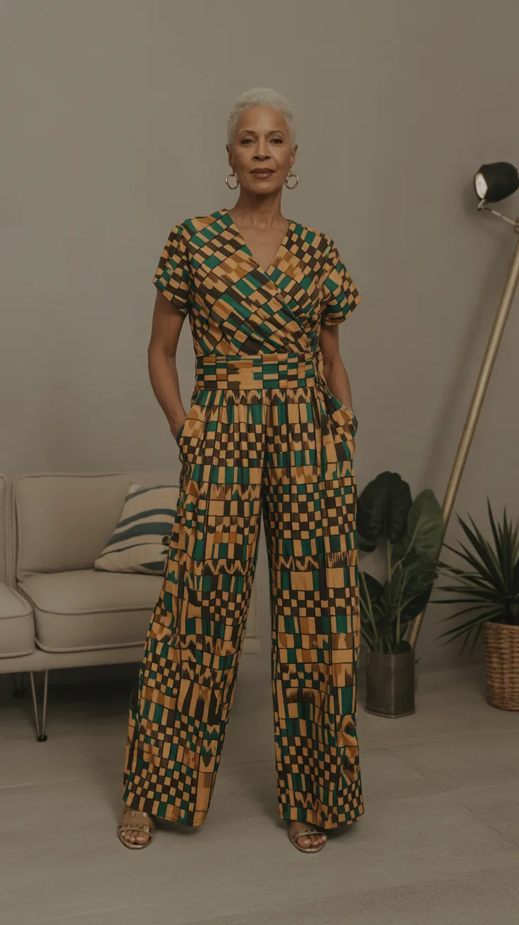 The Kente jumpsuit with a wrap bodice is a stunning choice for older women who want to showcase their style and cultural heritage. This outfit combines modern design with traditional Kente patterns, making it a perfect fit for various occasions.
