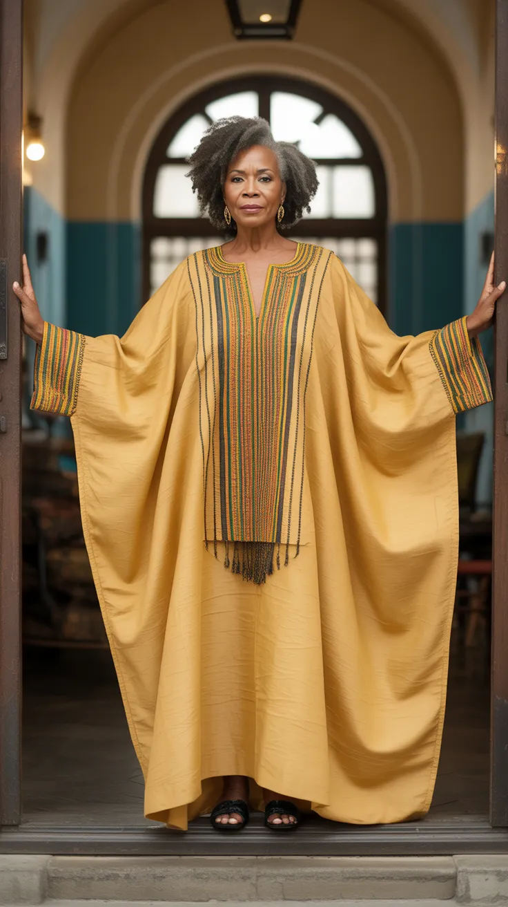 The yellow Kente caftan is a stunning choice for older women who want to showcase their style with grace. This piece features beautiful embroidered details that add a touch of elegance. The vibrant yellow color stands out, making it perfect for special occasions or everyday wear.