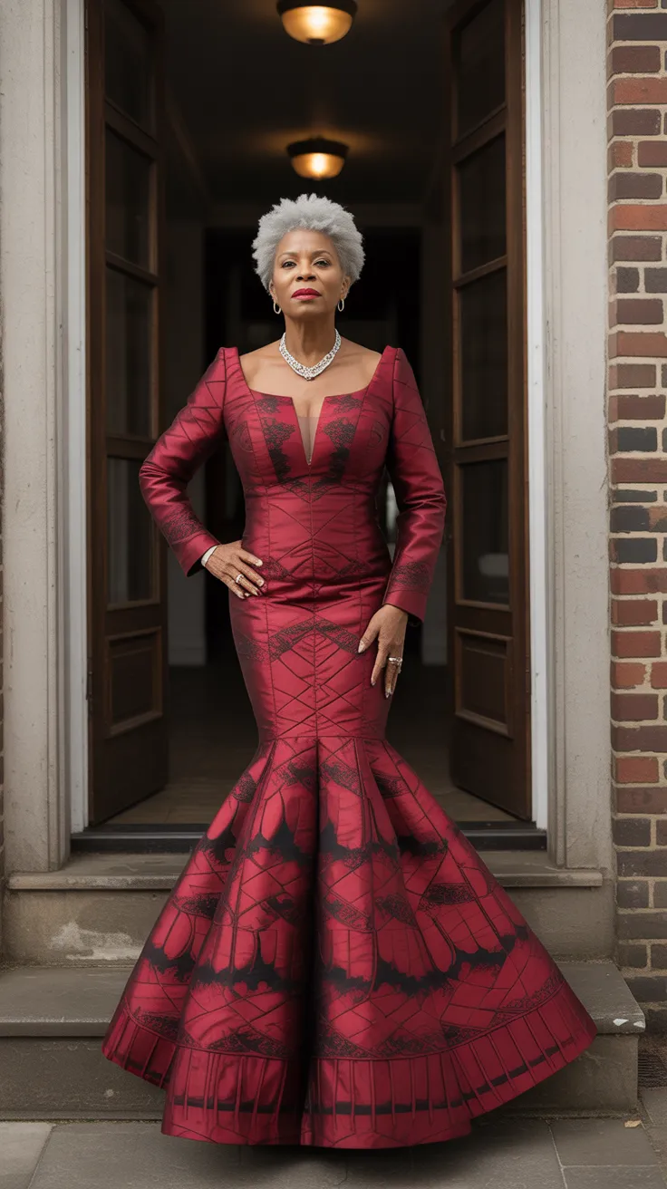 The red Kente mermaid gown is a stunning choice for older women who want to embrace their cultural heritage while looking modern. This gown features a beautiful silhouette that hugs the body and flares out at the bottom, creating an elegant look.