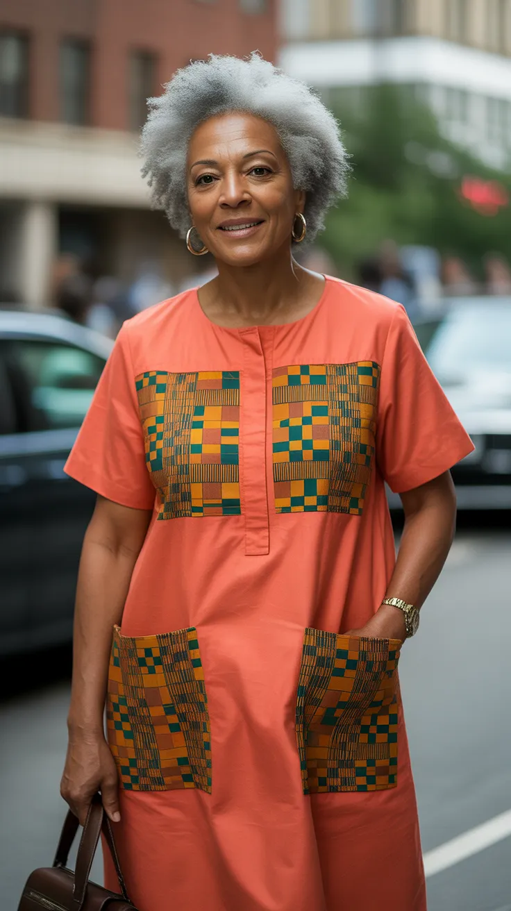 The orange Kente shift dress is a stunning choice for older women looking to blend modern style with cultural heritage. This dress features a simple yet elegant silhouette that flatters various body types. The vibrant orange color adds a cheerful touch, making it perfect for both casual outings and special occasions.