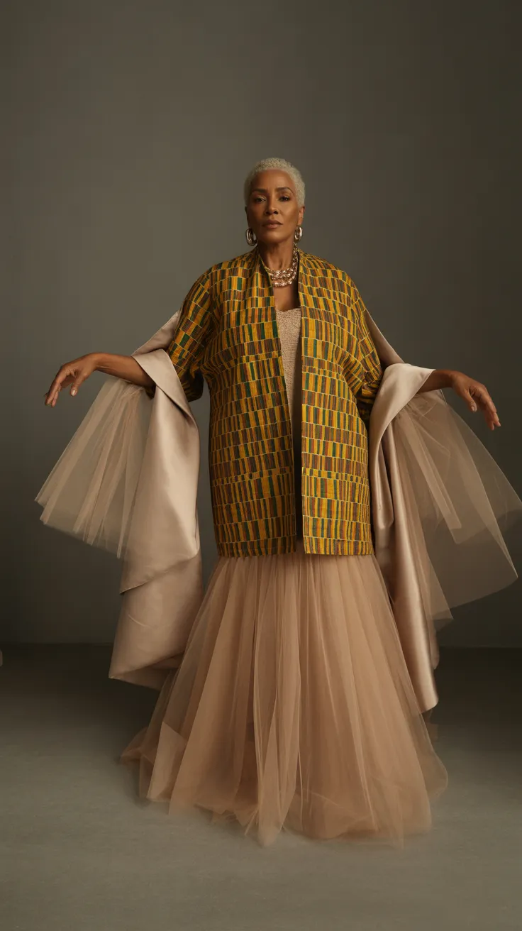 The Kente and tulle hybrid dress is a stunning blend of tradition and modernity. This style showcases the vibrant patterns of Kente fabric, which is rich in cultural significance. The bold colors and intricate designs make it a perfect choice for older women who want to express their heritage while staying stylish.
