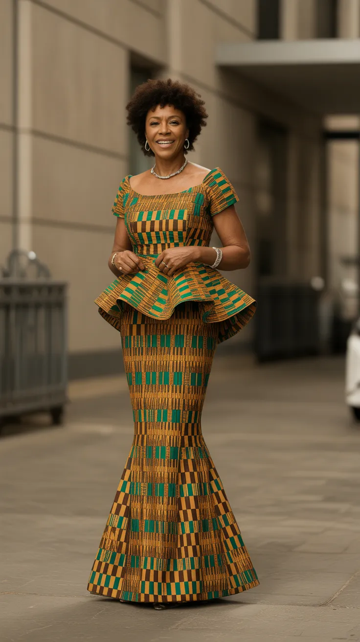 The modern fitted Kente gown with peplum detail is a stunning choice for older women who want to showcase their style and cultural heritage. This design combines traditional Kente fabric with a contemporary silhouette, making it perfect for various occasions.