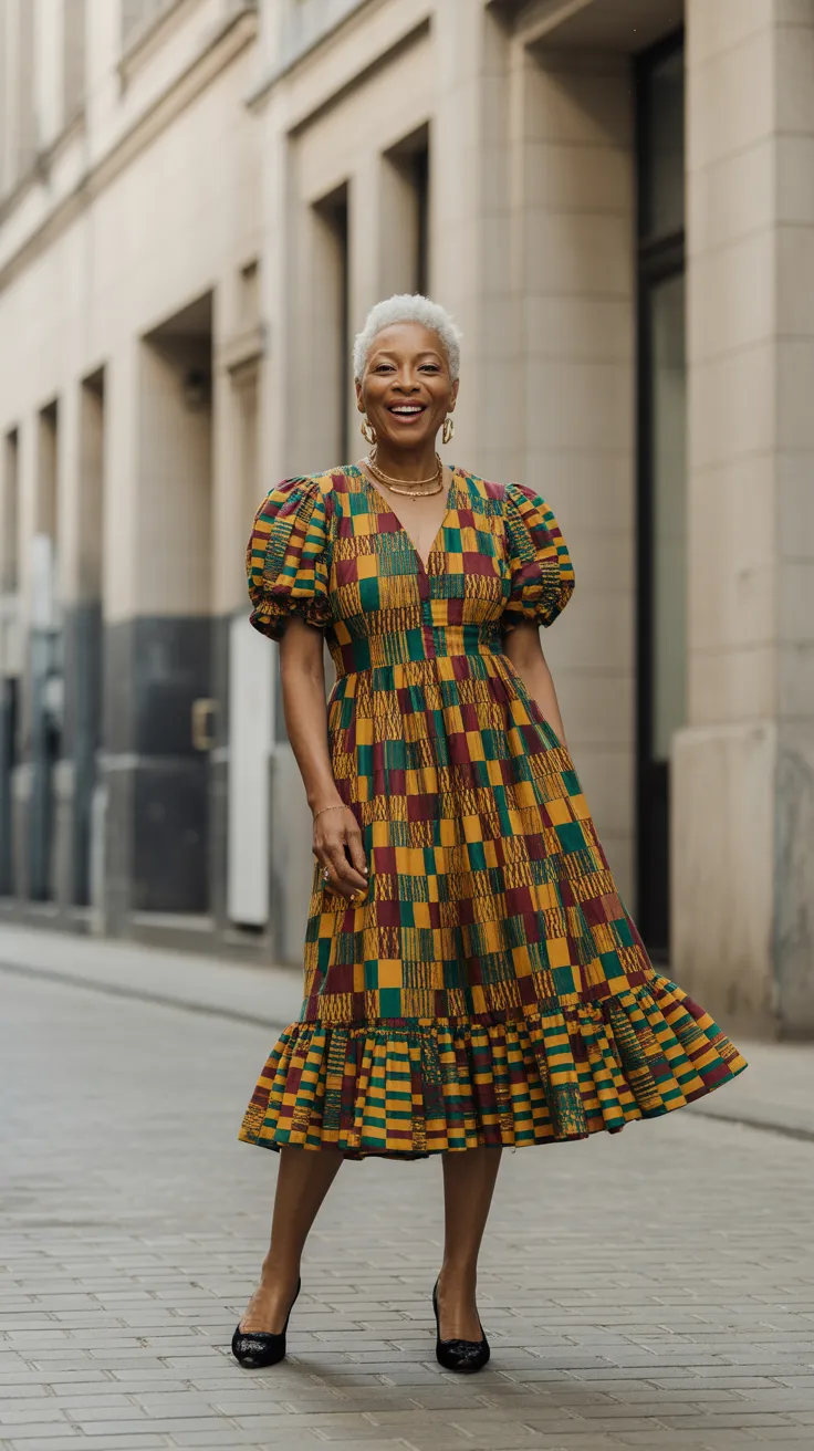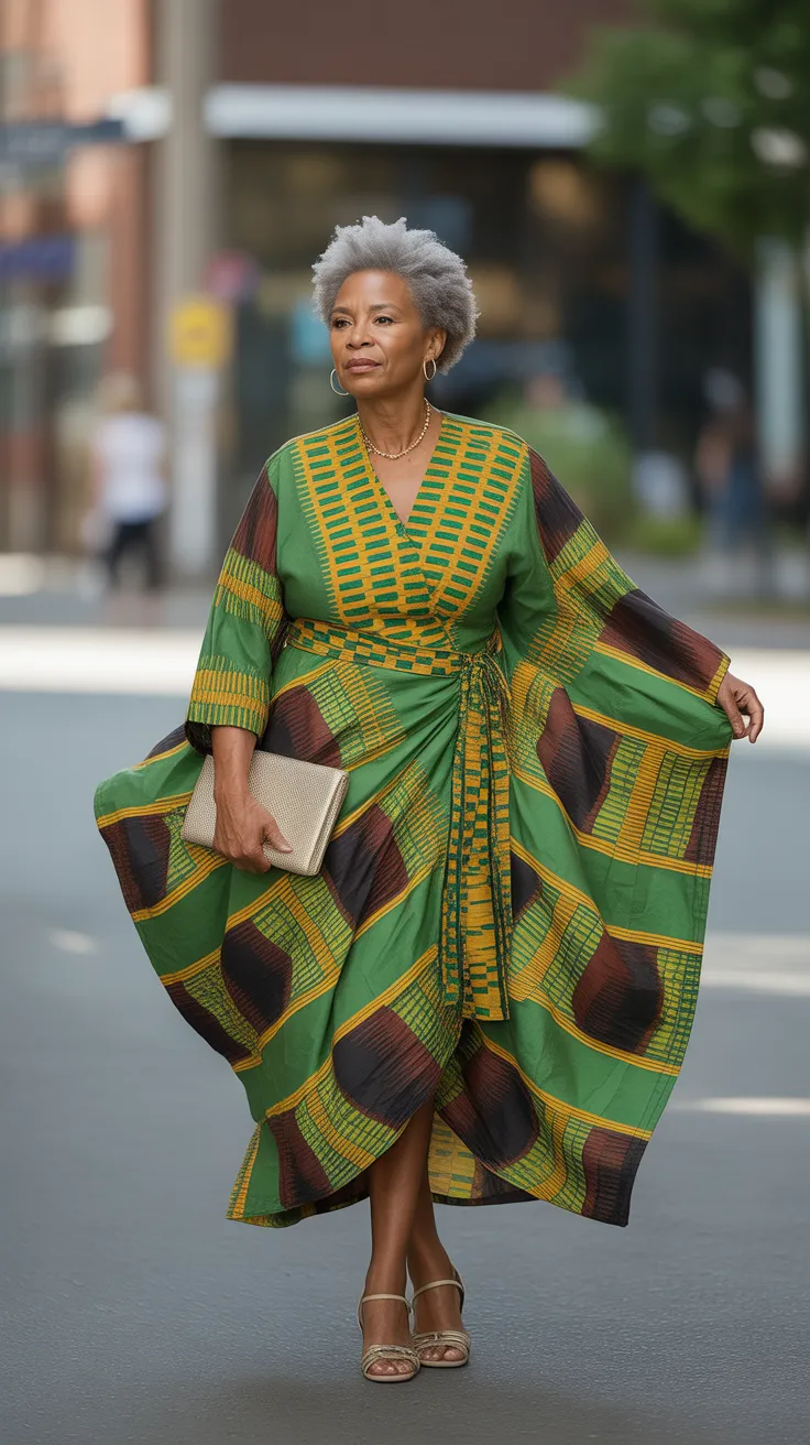The Kente midi dress with a ruffle hemline is a stunning choice for older women who want to embrace modern fashion while honoring cultural roots. The vibrant green fabric is adorned with beautiful floral patterns, showcasing the rich heritage of Kente cloth.