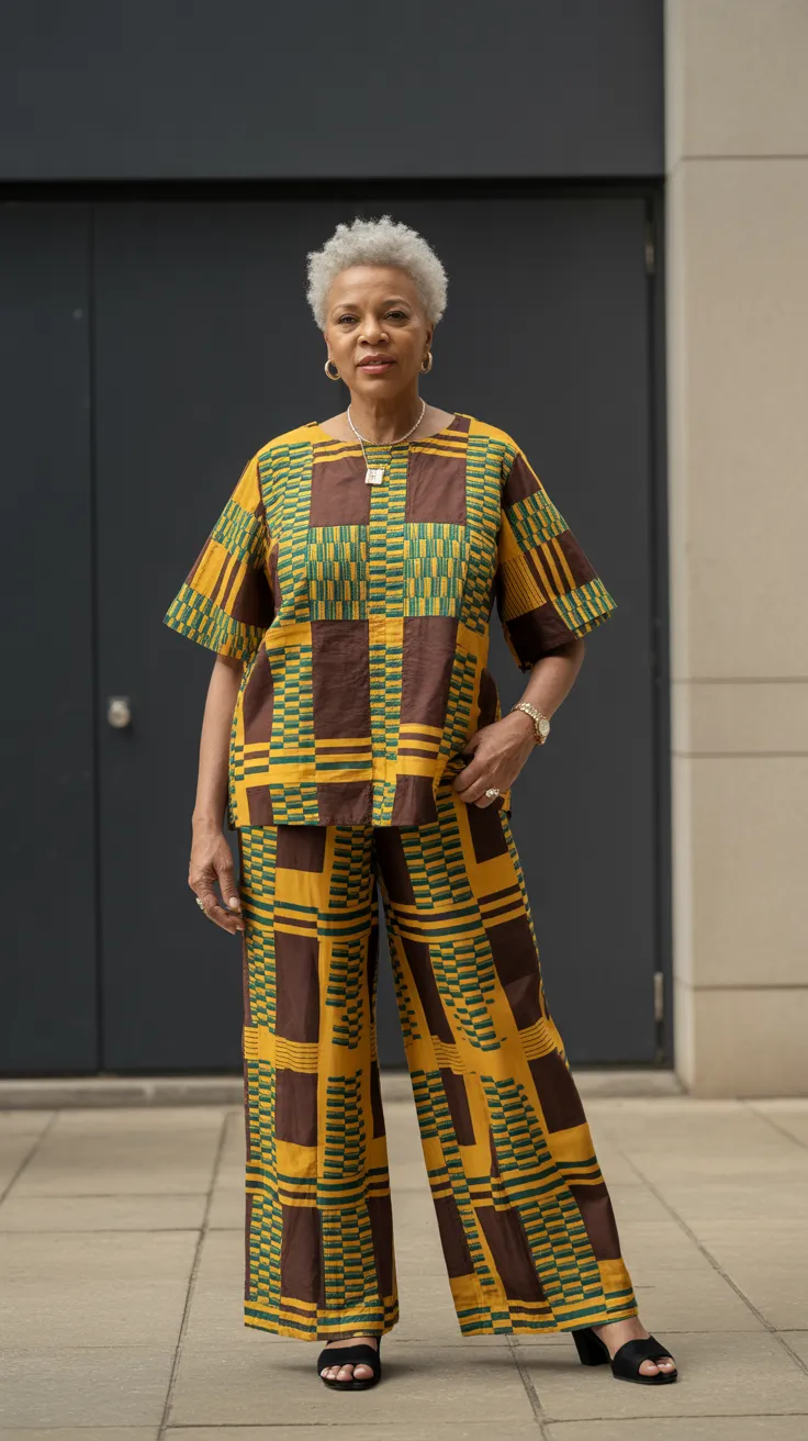 The two-piece Kente top and wide-leg pants set is a stunning choice for older women looking to blend tradition with modern flair. The vibrant colors and intricate patterns of Kente fabric bring a sense of cultural pride and elegance. This outfit is perfect for various occasions, from family gatherings to community events.
