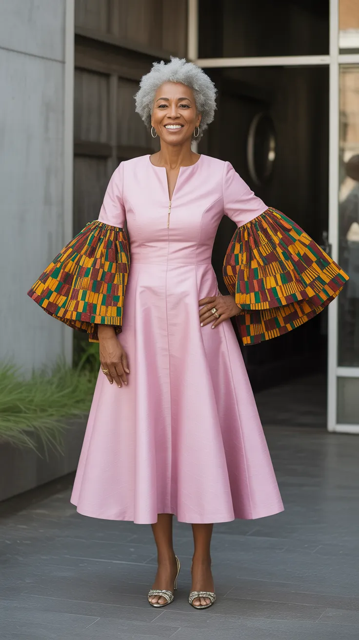 The pink Kente dress with bell sleeves is a stunning choice for older women looking to blend tradition with modern style. The soft pink hue adds a touch of femininity, while the bell sleeves offer a playful yet sophisticated flair. This design is perfect for various occasions, from family gatherings to formal events.