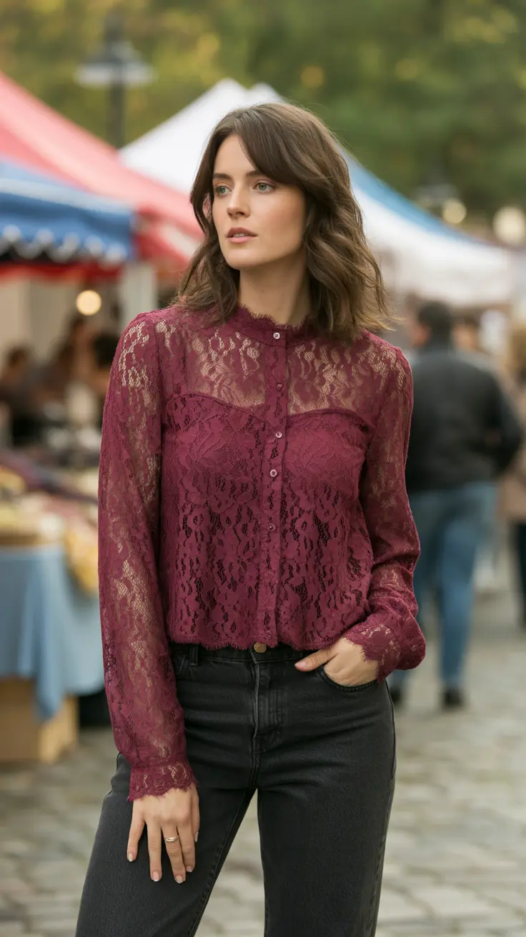 Dark jeans are a versatile choice that complements the rich color of the lace blouse. They provide a sleek silhouette, enhancing the overall look. This combination is ideal for a night out or a casual day at the café with friends.