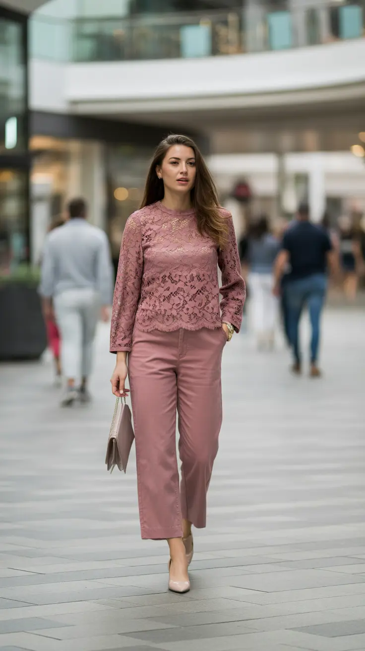 14. Dusty Rose Lace Long Sleeve Top Outfit With Cropped Trousers
