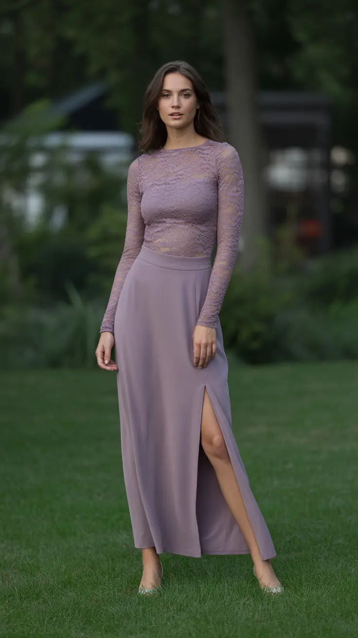 20. Mauve Lace Long Sleeve Top Outfit With Slit Maxi Skirt