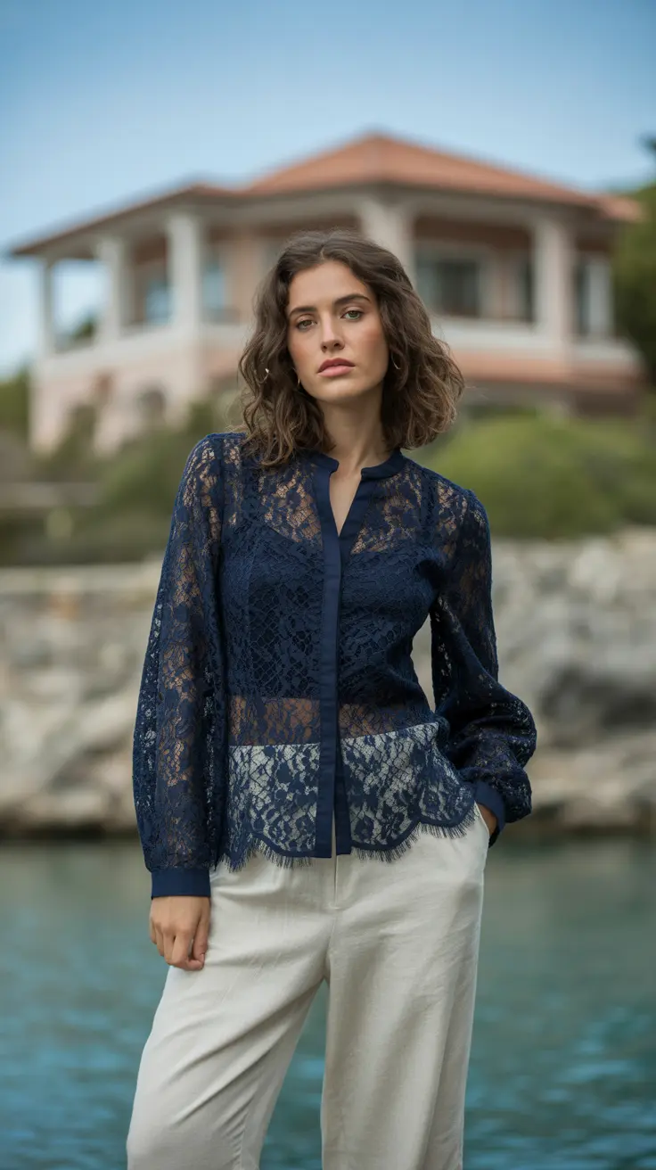 The navy lace long sleeve top is a stunning piece that brings a touch of elegance to any outfit. Its delicate lace detailing adds a feminine charm, making it perfect for various occasions. Pairing it with linen pants creates a relaxed yet chic look that is ideal for both casual outings and more polished events.