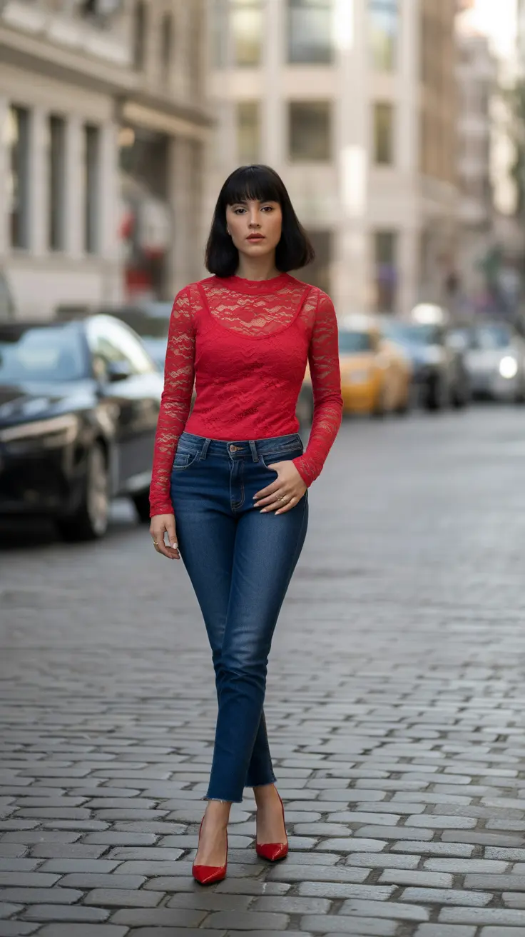 Heels elevate the look, adding height and sophistication. This combination is ideal for a night out or a special event. The contrast of the bold red with the classic black jeans offers a stylish edge.