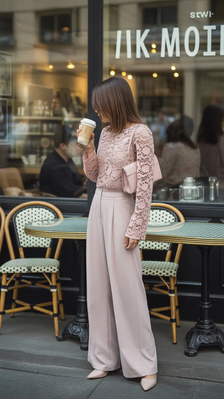 This outfit showcases a stunning blush pink lace long sleeve top paired with chic wide-leg pants. The delicate lace adds a feminine touch, making it perfect for various occasions. The soft pink color complements the crisp white pants beautifully, creating an elegant outfit idea that stands out.
