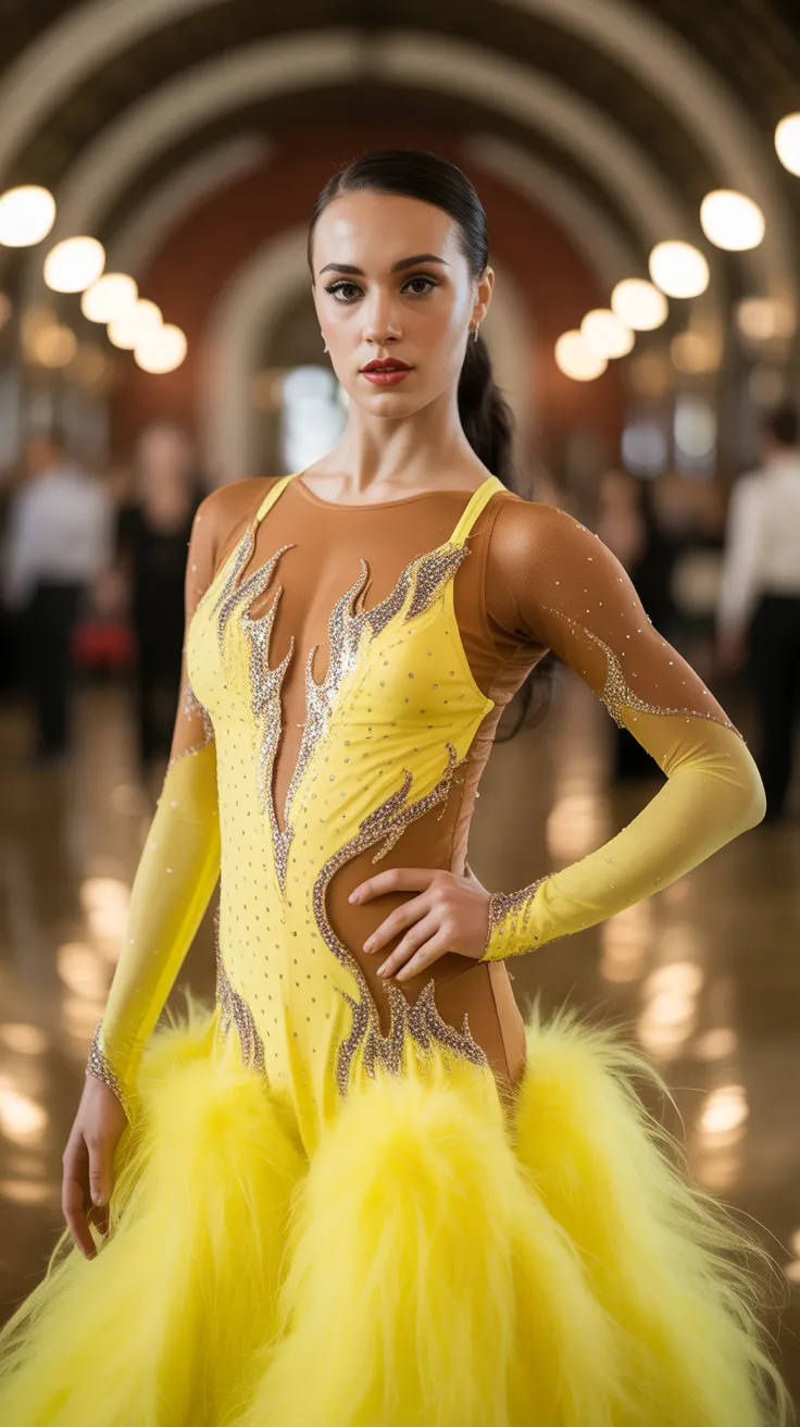This stunning yellow ballroom dance costume is a true showstopper. The vibrant color instantly grabs attention, making it perfect for any Latin dance outfit. The dress features eye-catching sequin flames that add a fiery touch, symbolizing the passion and energy of dance.