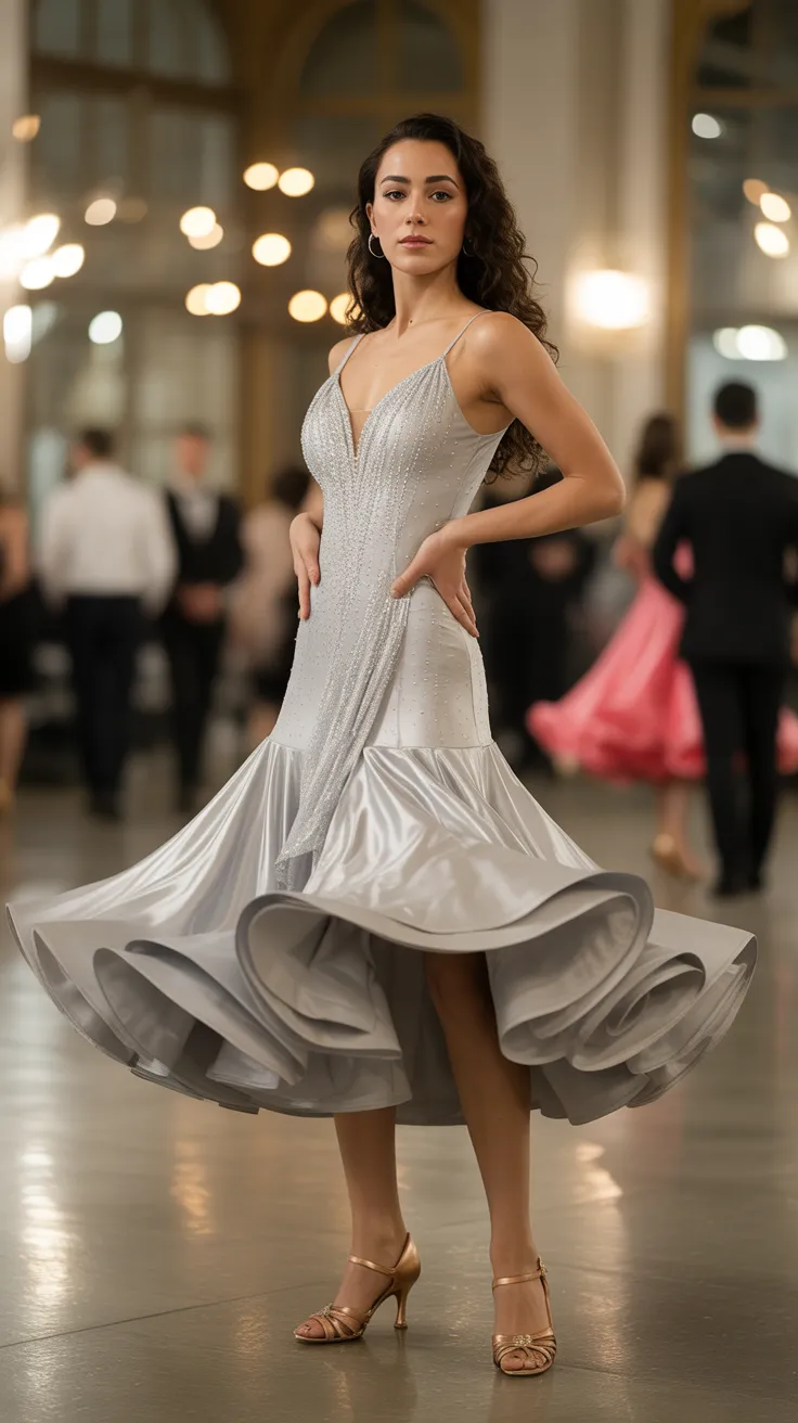14. Silver Ballroom Dress With Ruffle Hem