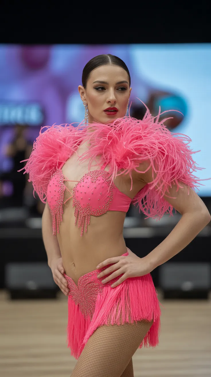 4. Hot Pink Latin Dance Outfit With Shoulder Feathers