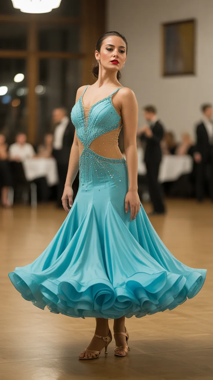 The cascading beads create a beautiful flow, enhancing every twirl and spin. As you dance, the beads catch the light, adding a sparkle that draws attention. This dress is not just about looks; it’s designed for performance, making it one of the best choices among ballroom dresses.