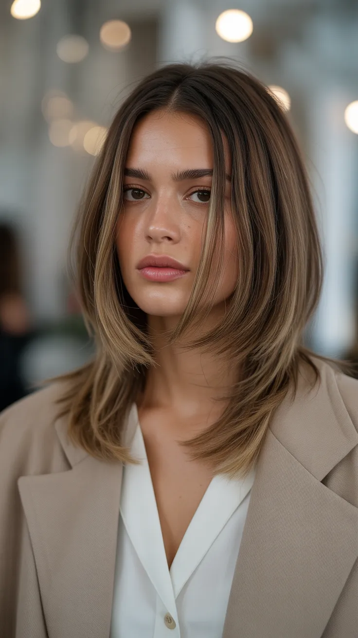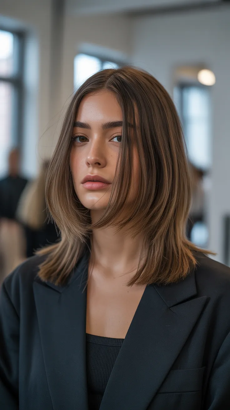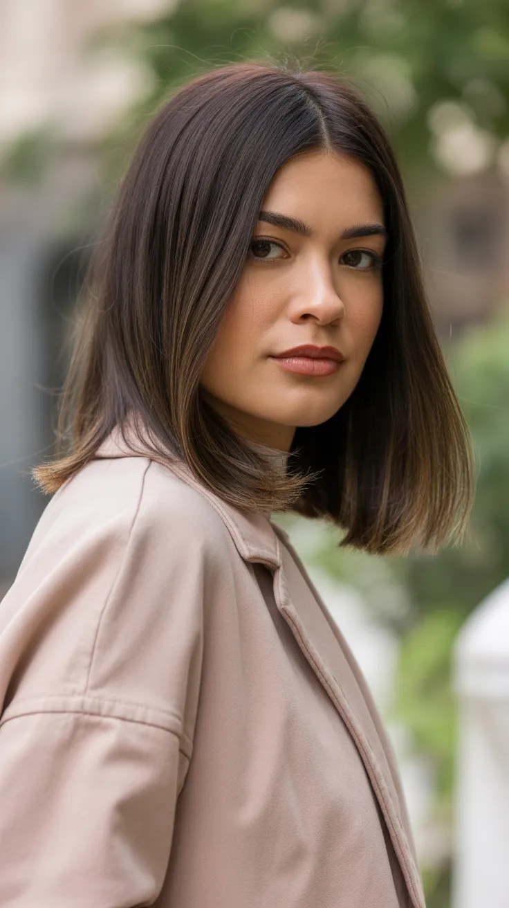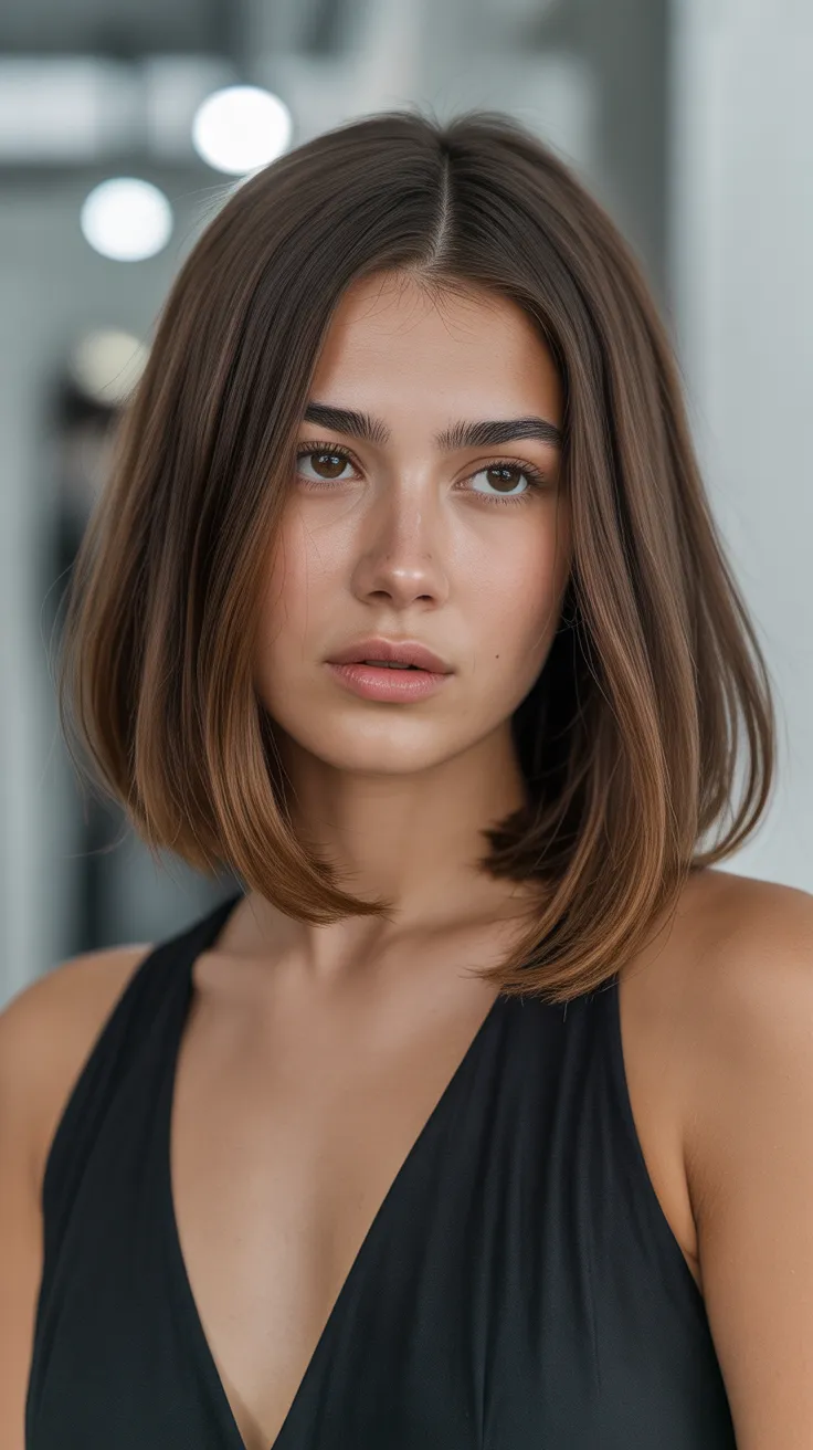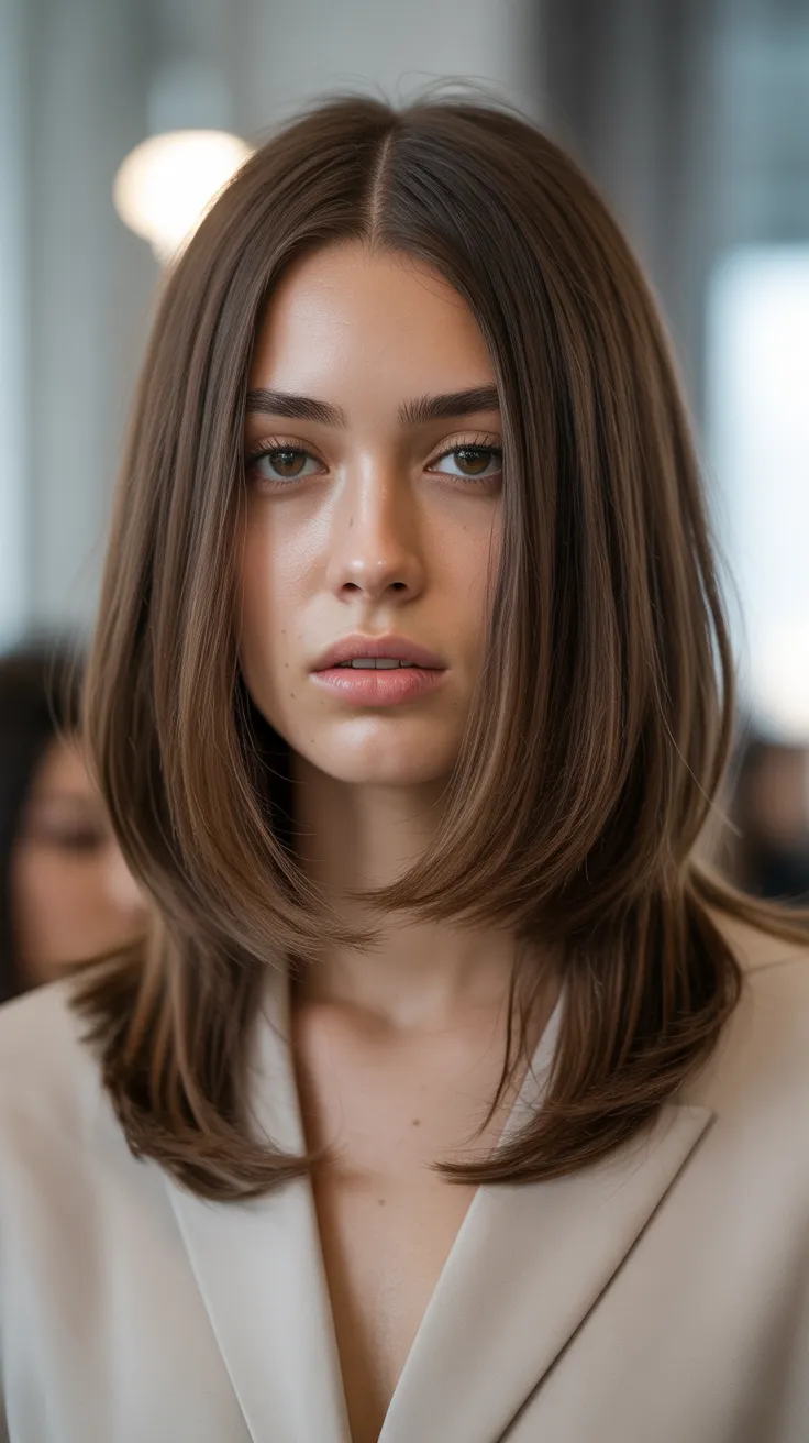 The model in the image showcases this style beautifully. Her hair falls just above the shoulders, with subtle layers that frame her face. The rich tones and shine highlight the haircut’s texture, making it a standout choice among layered haircuts for straight hair.