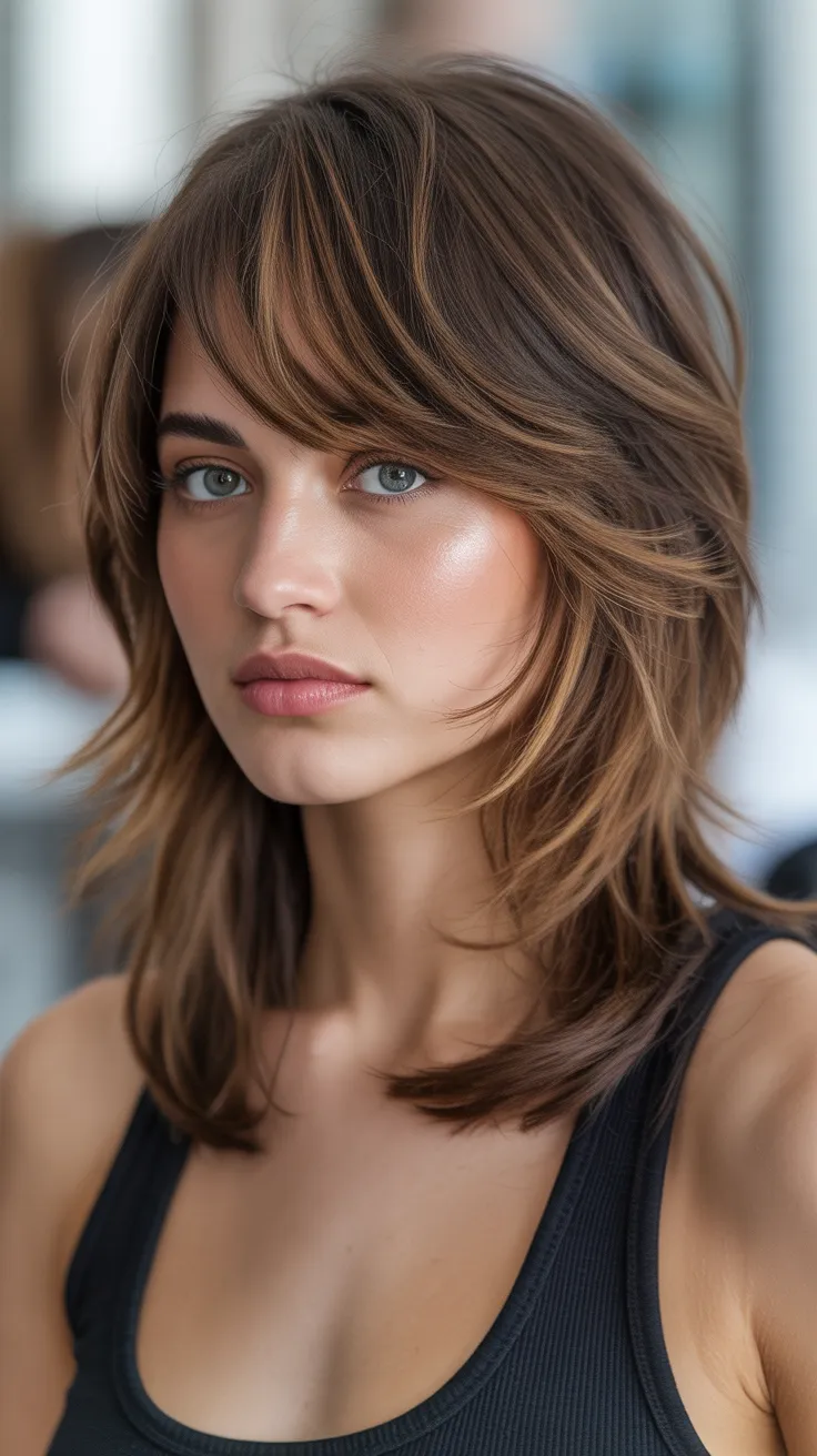 This brunette layered cut with side bangs is a stylish choice for anyone looking to refresh their look. The layers add movement and texture, making it one of the cutest cuts for medium hair. The side bangs frame the face beautifully, enhancing the overall appearance.