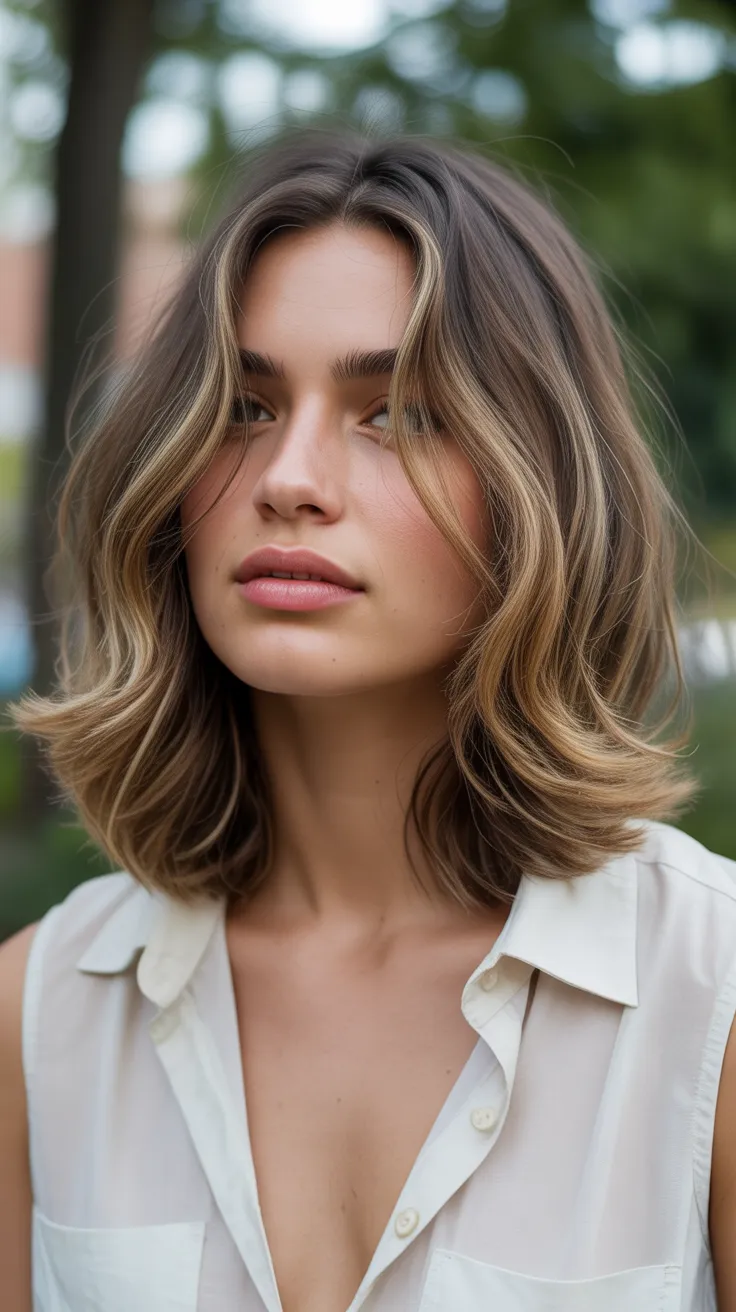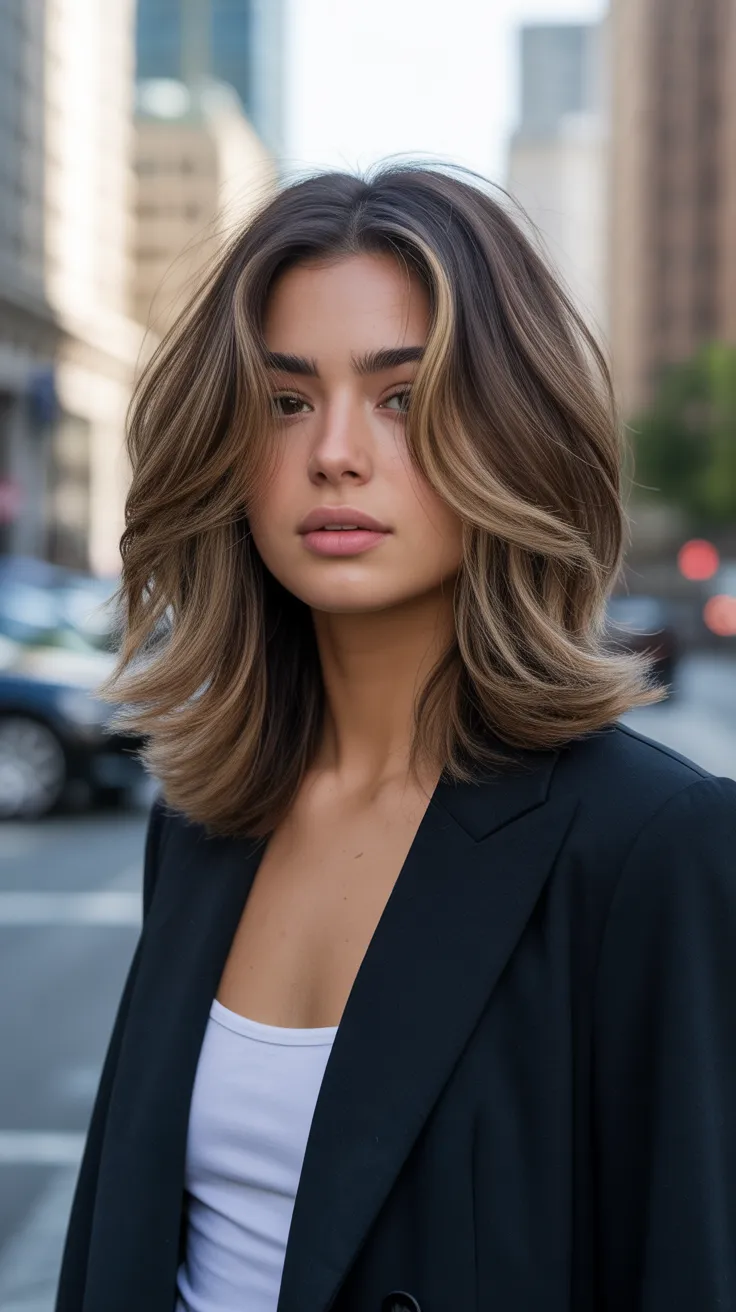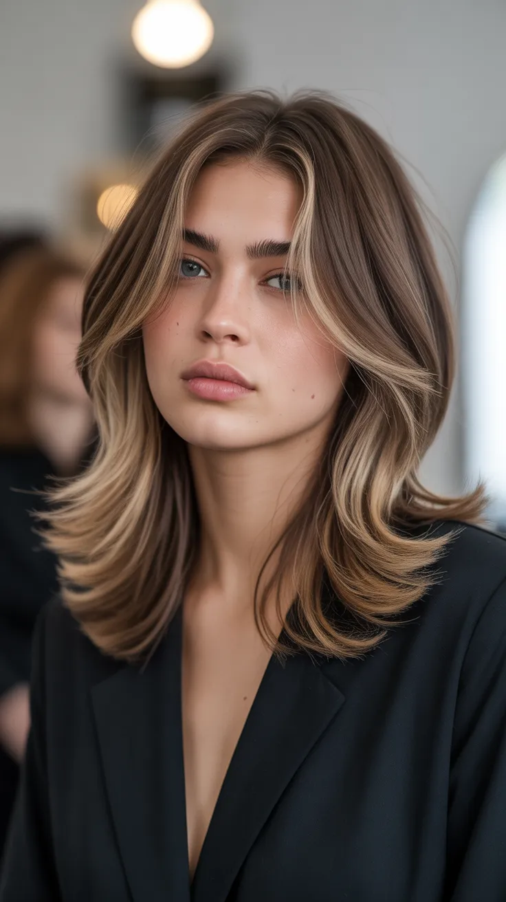 Layered midlength hair is a fantastic choice for those looking to refresh their style. The image showcases a beautiful example of this look, featuring soft, wavy layers that frame the face perfectly. The highlighted tips add a touch of brightness, creating a light and airy feel.