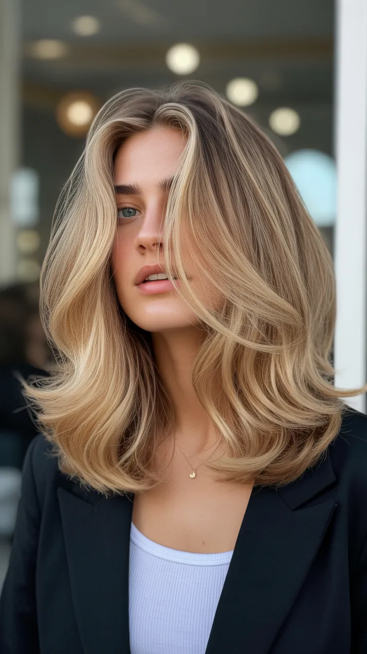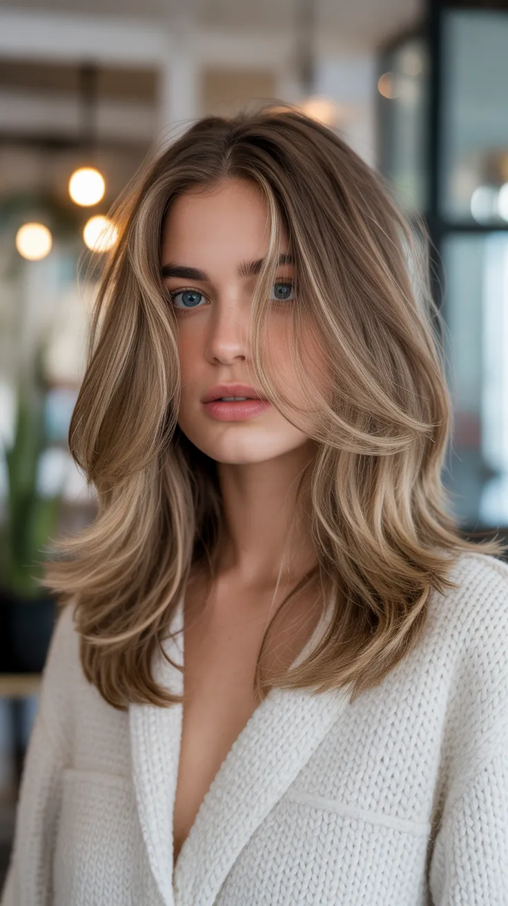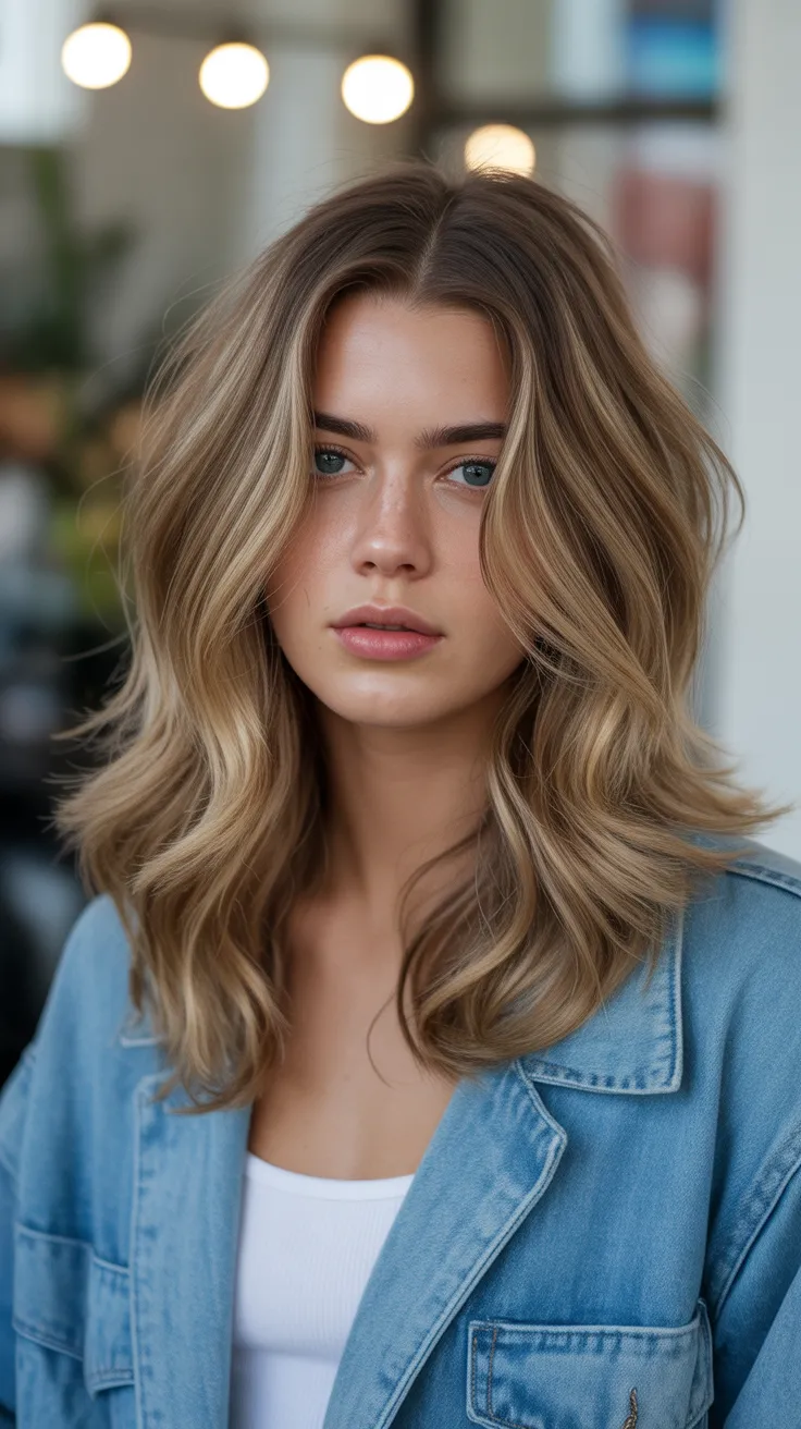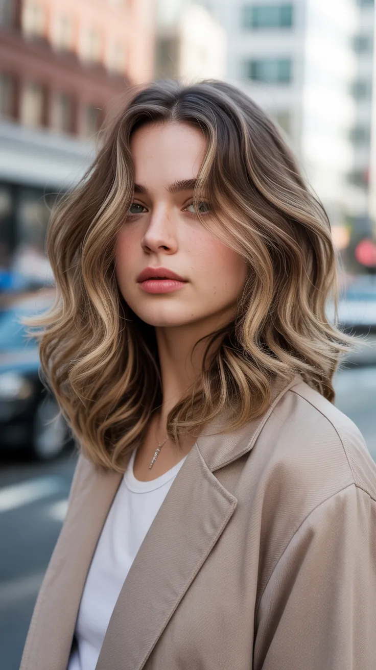 Layered midlength hair is a fantastic choice for those looking to refresh their style. The image showcases a beautiful example of this look, featuring soft, wavy layers that frame the face perfectly. The highlighted tips add a touch of brightness, creating a light and airy feel.