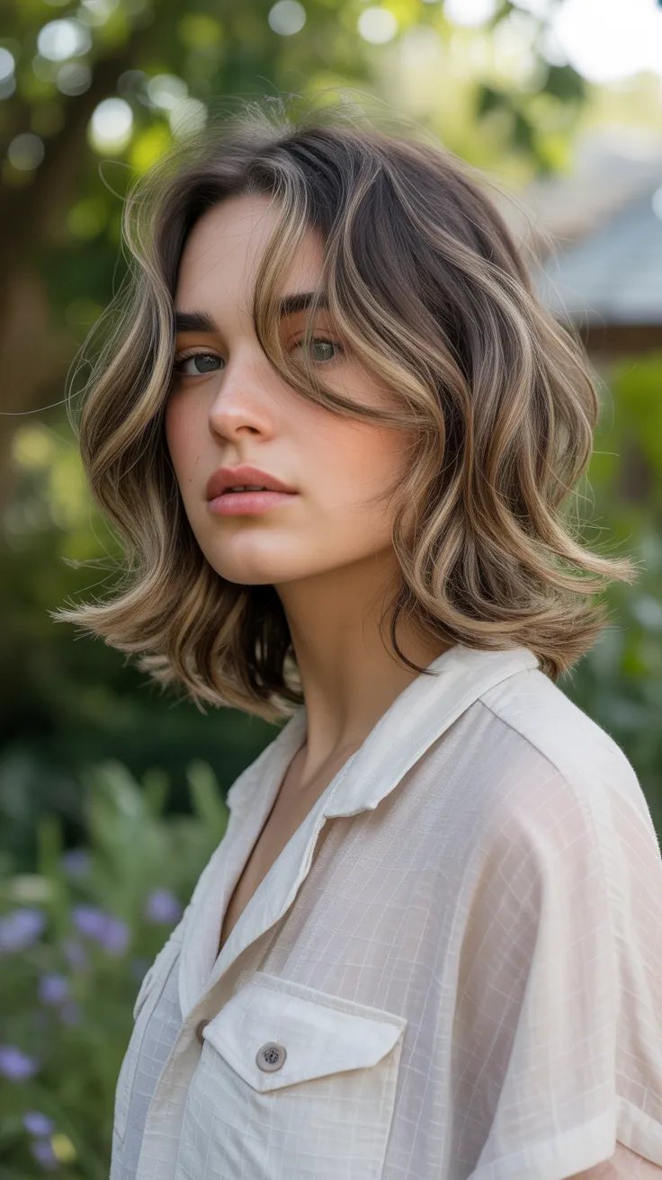 This hairstyle is a fantastic choice for anyone looking to add some flair to their mid-length hair. The wavy texture gives it a fresh and lively look, while the long face-framing layers create a soft, flattering silhouette. These layers help to accentuate facial features, making it a great option for various face shapes.