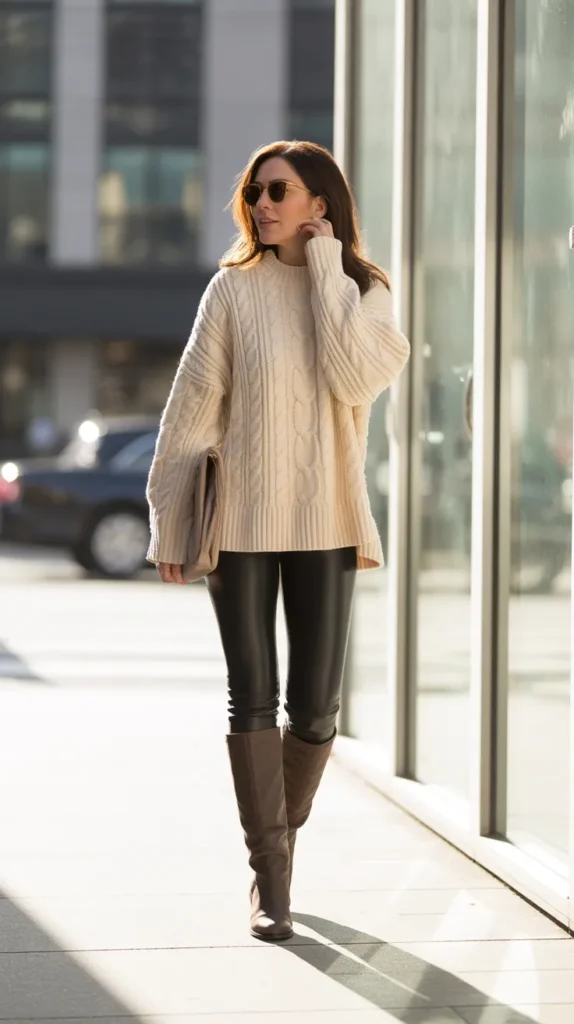 Classic, cozy, and effortlessly chic this combo never goes out of style. Sleek black leather leggings pair perfectly with a chunky cream cable-knit sweater, creating that soft-meets-edgy balance. Add tall brown boots to elongate your silhouette and a crossbody bag for a touch of polish. It’s the ideal go-to for chilly brunch dates or relaxed weekends that still feel put-together.
