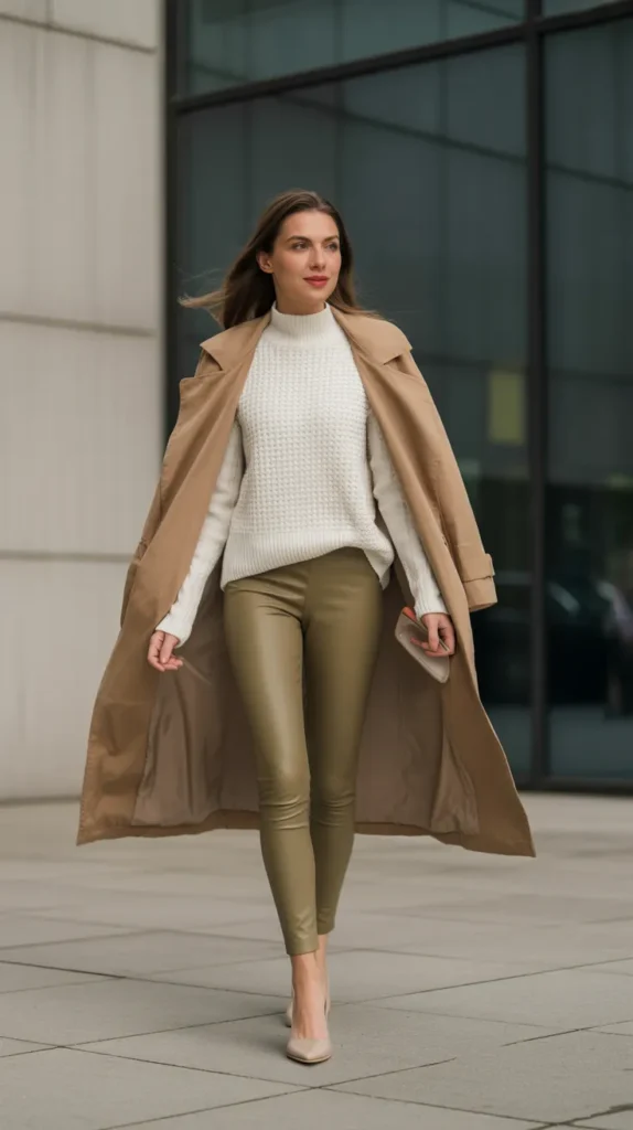 Modern, minimalist perfection. Olive-green leather leggings styled with a soft white sweater and a tan trench coat feel effortlessly elegant. Heeled booties and a structured tote pull the whole look together think “refined city girl” meets cozy comfort.