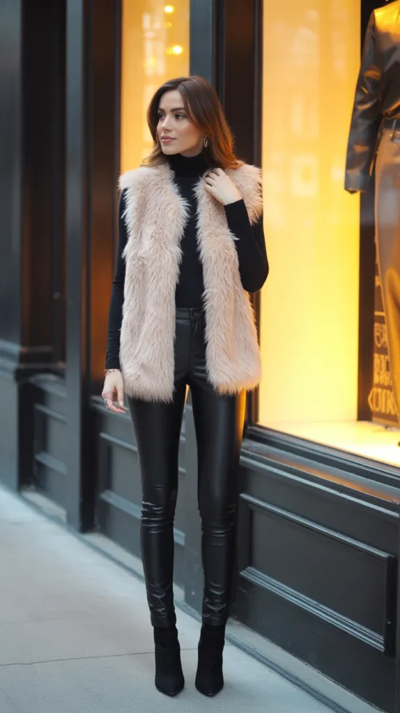 Rich textures, timeless appeal. A fitted black turtleneck paired with black leggings and topped with a cream faux-fur vest gives a luxe, layered feel. Add knee-high boots for warmth and height a stunning cold-weather look that’s equal parts elegant and cozy.