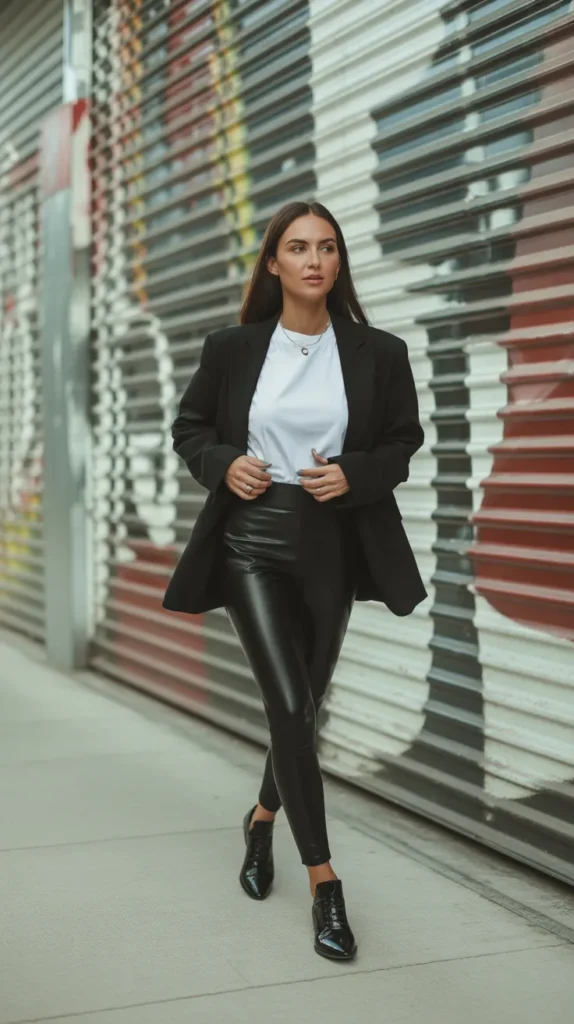 13. Black Leather Leggings with an Oversized Blazer and White Tee