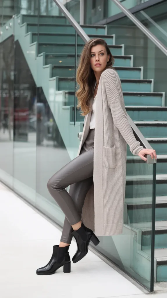 Cozy layers, minimal effort. Mid-grey leggings paired with an oatmeal longline cardigan and a soft wool scarf create a chic transitional outfit. Add ankle boots and a neutral tote perfect for travel, errands, or laid-back office days.