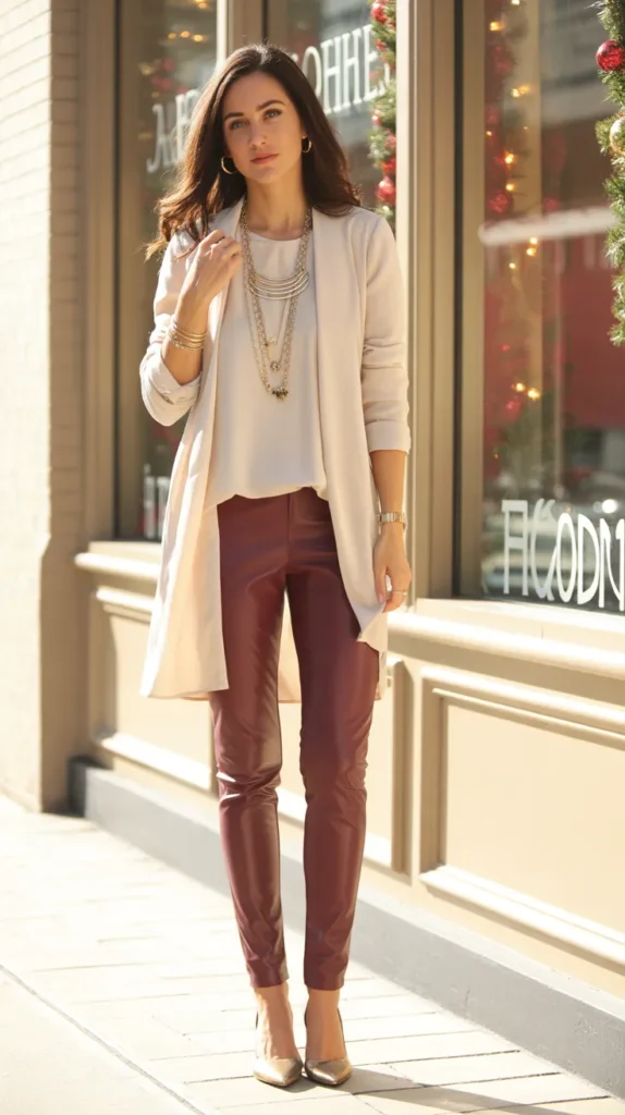 15. Maroon Leather Leggings with a Cream Tunic and Statement Necklace